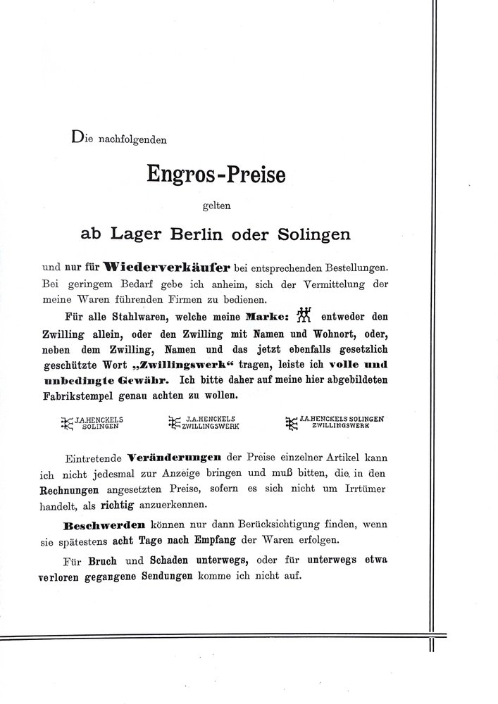Торговые марки: Zwilling (23.02.1871); Wotan (1898 № 30775); Zwillingswerk (1899 № 36677); Henckels (1898 № 30897); Zwillinge (1899 № 36676); Henckelswerk (1901 № 50354); Vacuum; Acutal; Blitznieta; Coltelleria; Twin Works; Noxida; Twins.