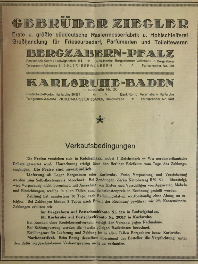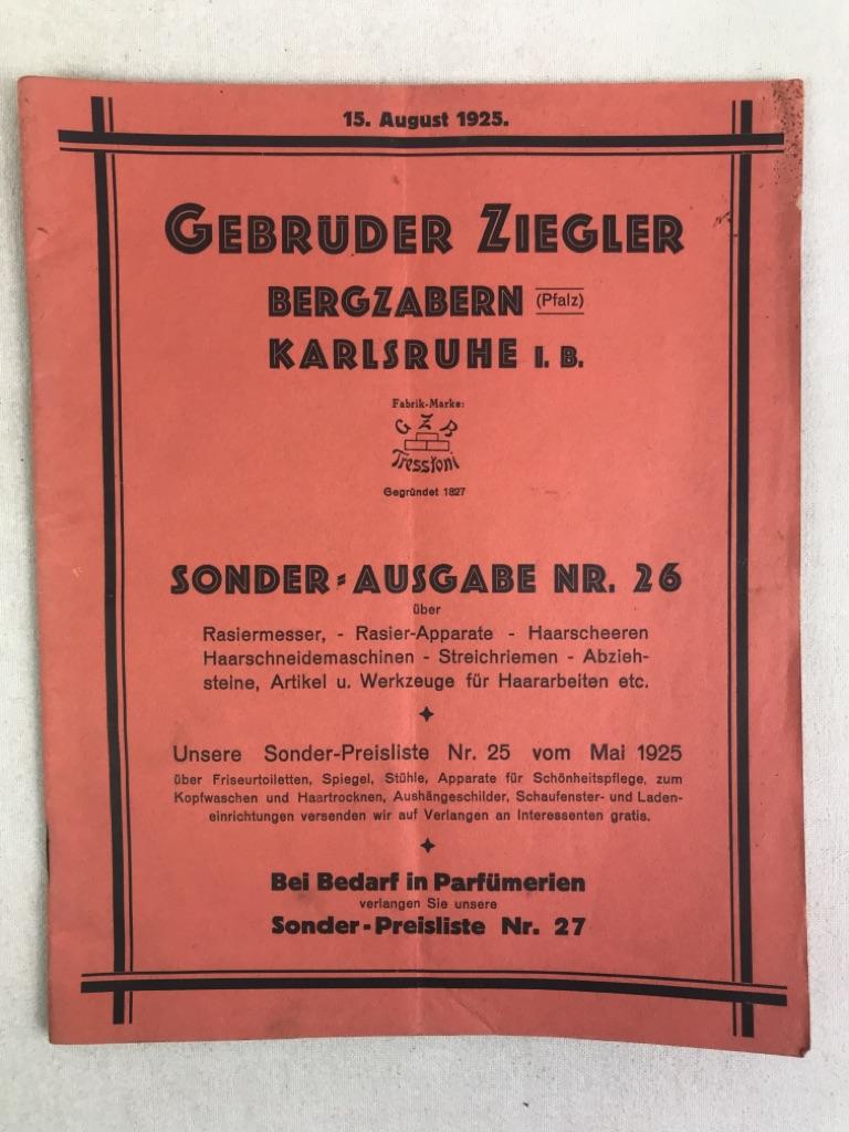 Первый и самый большой завод в Южной Германии по производству бритв и шилифовки. Бритвы Ziegler . французская форма, лучшая английская сильвер-сталь, округлый носик и закругленная спинка. Номер 144 - 13мм номер 145 - 16мм номер 146 - 19мм вогнутости 1/4, 1/2, полная. Французские бритвы, бренд GZB (по первым буквам названия - прим.) номер 42 вогнутость 1/4 ширина 10, 13,16,19 мм. На второй стороне условия отправки каталога N 12. про первый и самый большой завод тоже на второй стороне, снизу. Под вопросом, конечно, про завод, но что написано, то написано. Gebruder Ziegler Bergzabern Pfalz Tresstoniвот набор бритв номер 42, шириной 10, 13,16,19 мм. Из каталога 1925 года: