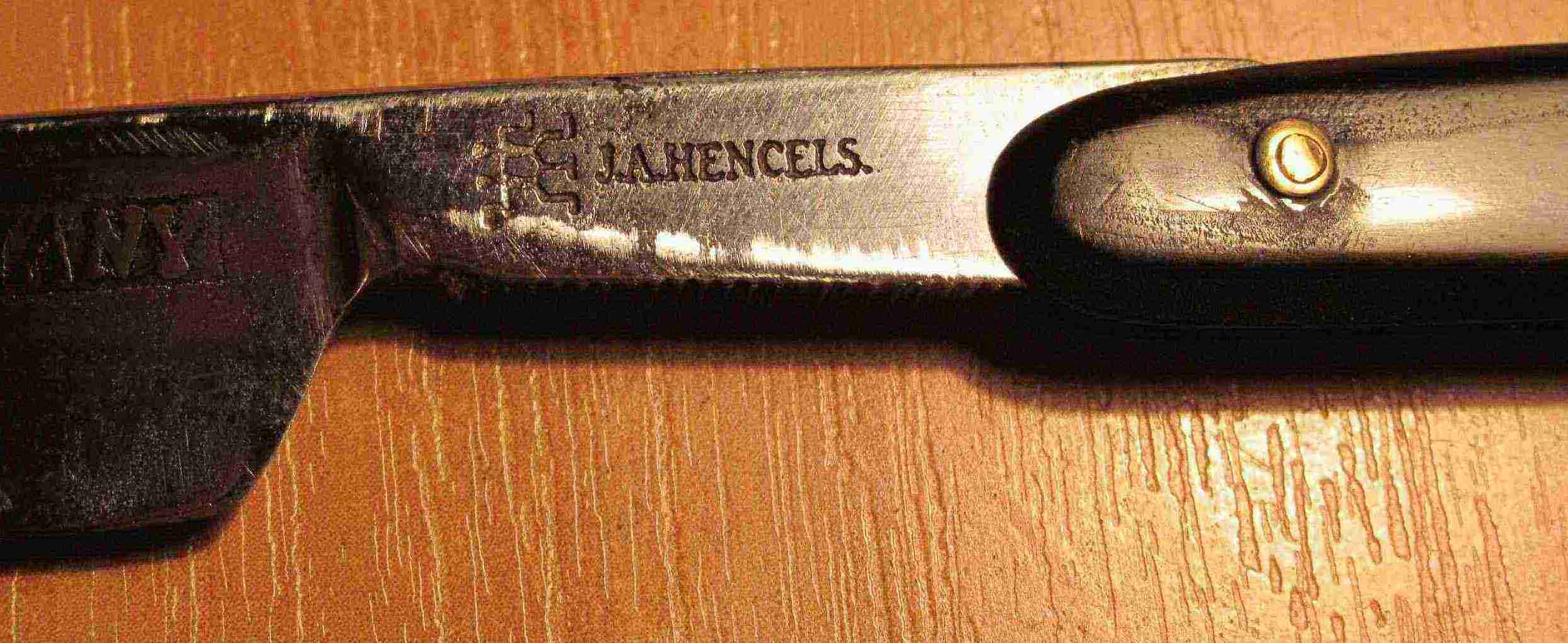 Некоторые бритвы Henckels уже отработали своё. Одно такое лезвие имеет знак Близнецов и ряд глубоко вытравленных цветов. Лезвие было найдено с резной ручкой, которая сделана предположительно из кости, несмотря на довольно бледный и гладкий вид поверхности. Большинство моделей резных ручек других фирм оформлены довольно несложно, в виде прямых линий или, возможно, резных вдоль края ручки. Резные ручки Henckels более сложны в оформлении, и бывают изменены даже по контуру. Задняя сторона хвостовика этой бритвы маркирована «GRAEF/SCHMIDT». Коробка из-под ножниц указывает на то, что эта фирма была какое-то время единственными торговыми представителями бритв Henckels в Соединённых Штатах.