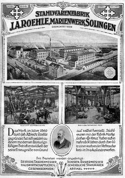 Из известного источника: J.A. Roehle, Marienwerk, Solingen. Brand name: Goten-Klinge. Производитель опасных бритв. Далее: Фирма была основана в 1869 году Joh. Albrecht Roehle. В 1895 году торговая марка Gothenkreuz зарегистрирована J.A. Roehle. В 1913 году фирма находилась на Kronprinzenstraße 125. В 1922 году компания расширила ассортимент карманными ножами с ручками из черепахового панцыря. В 1929 году фирма находилась на Düsseldorfer Straße 115-127 (улица была переименована в том же году в связи с объединением города Золинген с некоторыми, ранее отдельными, соседними городами). В 1929 году владельцы фирмы - Paul и Walter Roehle. Ещё ТМ: ELHEOR! Чё-то было возбУждено супротив фирмы в 1929... http://www2.solingen.de/C12572F800380BE ... _Nachf.pdf" onclick="window.open(this.href);return false; Вся инфа из инэта! Ничё, Егор рукастый! Скоро изобразит такое - челюсть отвалится! Наш человек! Ремонт опасных бритв, звонить с 11-00 до 23-00, +79267729357, (whats app, telegram, VK), спросить Олега.