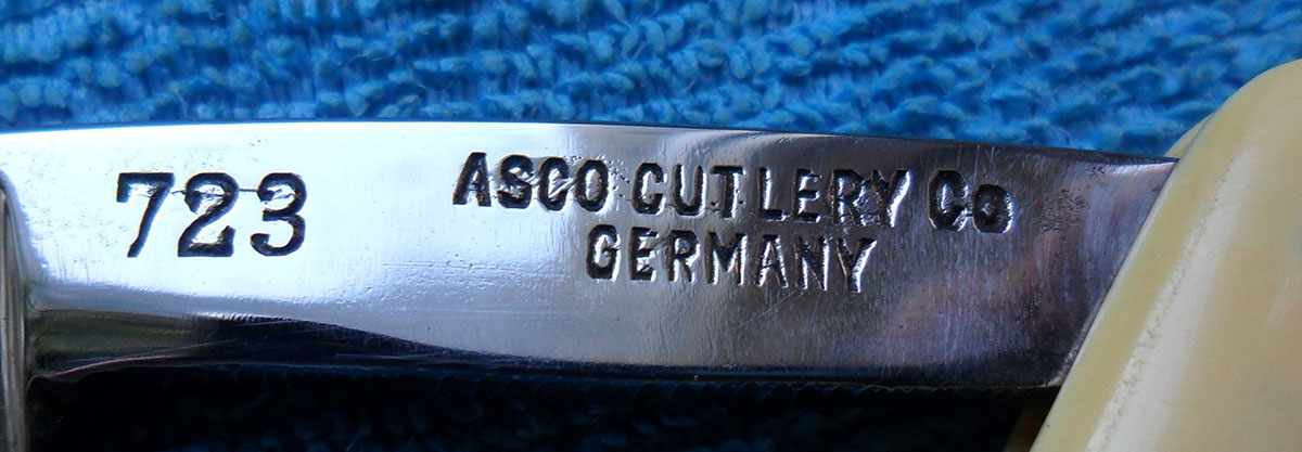 Re: ASCO CUTLERYstrazors.com: The company in business since 1900. (Несколько фото, одном из гих на картоне хорошо читается тиснение: Germany возле торца. Эта же бритва пробегала на eBay.)