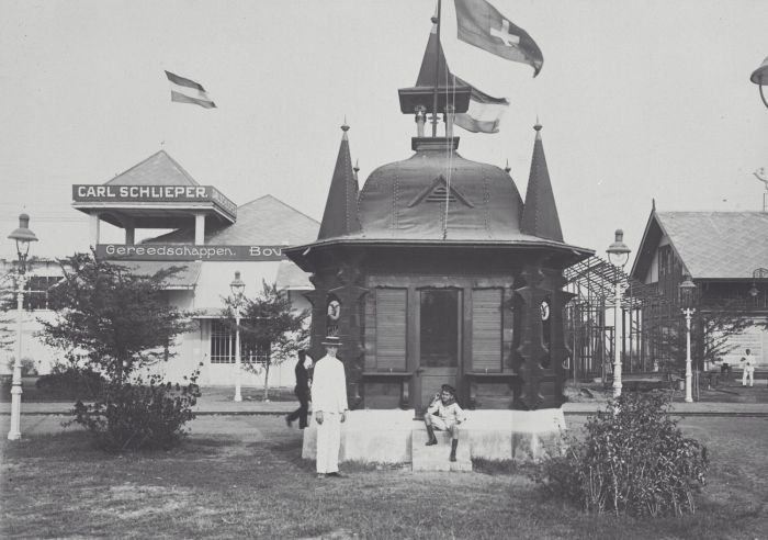 Павильон Карла Шлипера на заднем плане слева на Колониальной выставке в Семаранге (1914 г.), также виден знак «gereedschappen» (инструменты).