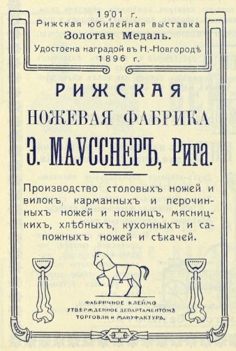 Рижская ножевая фабрика. 1911 год, Э. Маусснеръ, а точнее Эмилия Людвиговна Золотая медаль на Рижской выставке 1901 года. Вот их стенд на этой выставке. Фирма в Риге основана в 1887 году