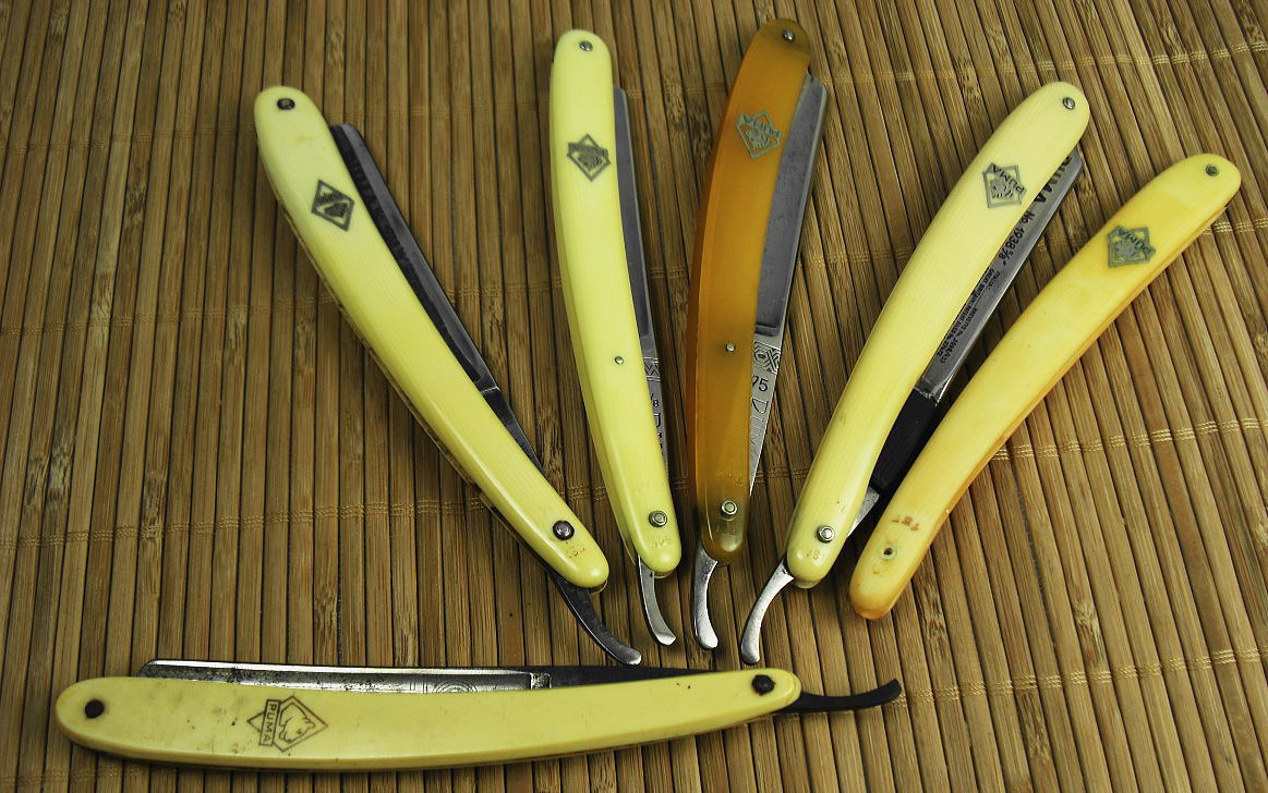 Примечательно что у пяти ручек с одной стороны, где стоят цифры, - инкрустация металлом, а у бритвы без цифр картина выжжена на ручке (или вытравлена).