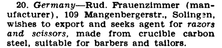 желает экспортировать и ищет агента по продажам бритв и ножниц, изготовленных из тигельной углеродистой стали. Для парикмахеров и портных.