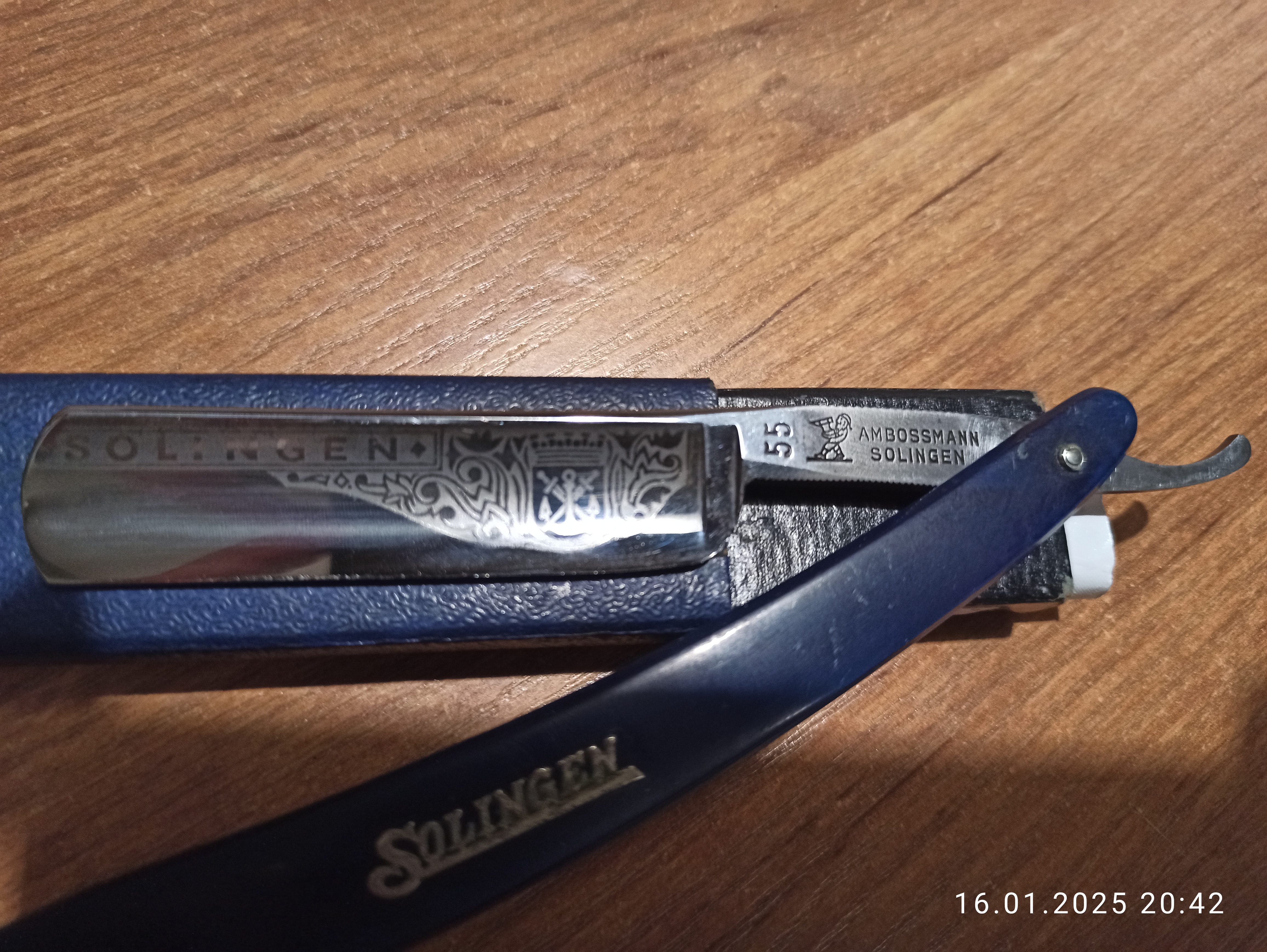 На сей раз опасная бритва досталась из антикварного магазина г. Минска. Теперь надо бы разузнать побольше о производителе итп. То, что 'Amboss' - наковальня, а 'Mann' - мужик, это понятно и по логотипу - мужик тащит наковальню (вообще-то похож на гнома, значит правильно будет "мужичёк тащит офигенную наковальню"  )