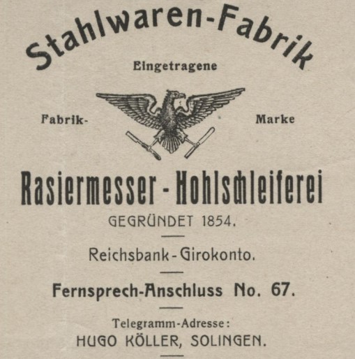 • Hugo Köller. Solingen: Grünewalder Strasse 28 in 1939-99, An der Eichen 20-22 from 1999. Brand names: 'Aarwerk' (1913), 'Hygenie' (1912/13), 'Koeller' (1900), "Koller's" (1980s), 'Kriegsruf-Bahnfrei!' (1915), 'Plum' (1924-5), 'Parforce' (1904), 'Propaganda' (1925).