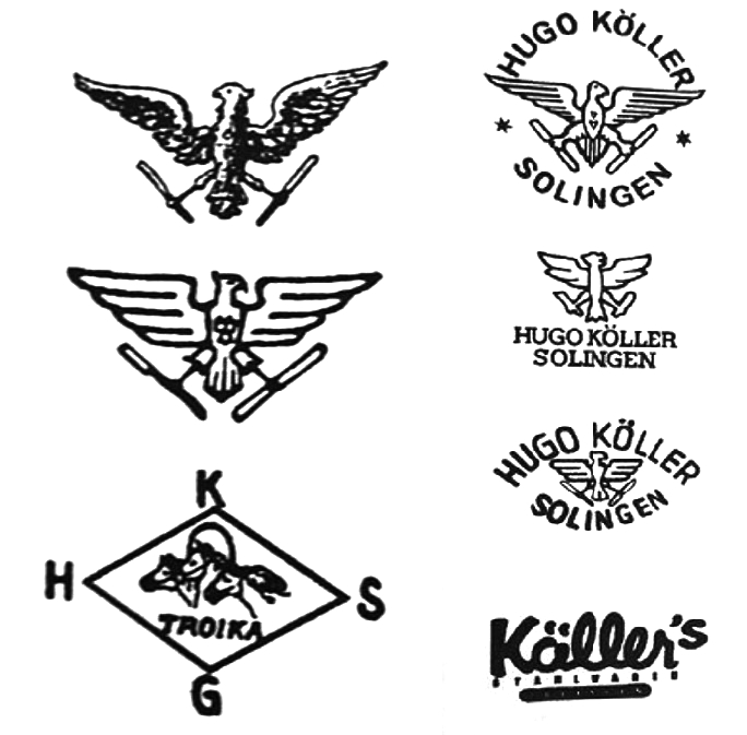 HUGO KÖLLER wurde 1861 in Solingen als Stahlwarenfabrik gegründet und stellte hochwertige Gartenwerkzeuge und Messer unter verschiedenen Markenzeichen her. In Verbindung mit dem Firmennamen wurden Messer meist mit mit einem Markenzeichen gekennzeichnet, das einen Adler mit ausgebreiteten Schwingen darstellt.