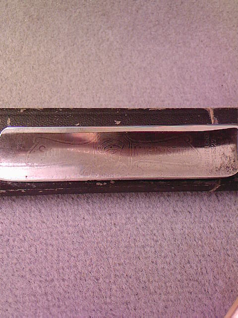 Спасибо за информацию!Посмотрел повнимательнее ,действительно Rob.Giersch ручка прикрывает последнею букву на 2/3 ...Выкладываю фото...военный как военный.WARENZEICHE да,через одну А,посмотрел через лупу...там просто порожения металла..сразу не разглядеть.Покупал оптом партию бритв,продавец особенно парился за эту бритву....мол ценная.Хотя понятно было,что ручка не оригинал...Но мне больше другая понравилась..Скромно и со вкусом.PEARSON&Co SHEFFIELD на эрле крылышко и слово TIME.На обушке крупно цифра 2 и цветы по бокам.По оформлению,как будто тоже веще первой половины 20 века?Ничего с ней делал..только тряпочкой нежно протер...заблестела как новая.А оценку хотел знать...не дорого ли дядя с меня слупил.