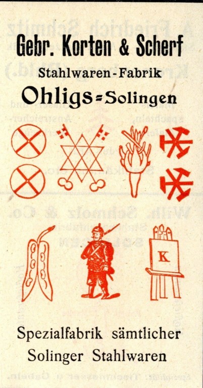 Это фирма производила и экспортировала широкий спектр карманных ножей, ножниц, бритв и столовых приборов. Она зарегистрировала чрезвычайно большое число брэндоа и товарных знаков. Но к 1920 году в их рекламныж объявлениях используются только две торговые марки - окружность с крестами и тройные молотки. В экспортных списках перечислены все типы Золингеновской металлической продукции, карманные и перочинные ножи, ножницы, бритвы и столовые приборы. Раннее военно-рекламное издание Messer und Schere (ножи и ножницы) иллюстрирует военный карманный нож с одним большим лезвием и консервным, и их специализацию в производстве столовых и военных ножей.