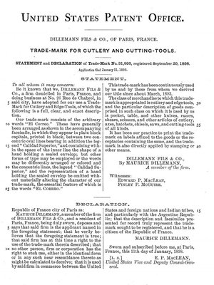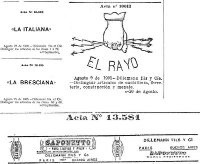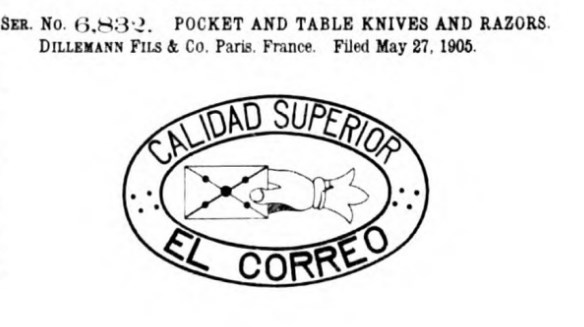 Это DILLEMANN FILS & CO. Из описания патента(с сокращениями): Spoiler Show DILLEMANN FILS & CO., Paris, France, and doing business at No. 26 Rue de Chabrol ПАРИЖ, ФРАНЦИЯ. ТОРГОВАЯ МАРКА СТОЛОВЫХ ПРИБОРОВ И РЕЖУЩИХ ИНСТРУМЕНТОВ. Заявление и декларация товарный знак за № 31,995, зарегистрирована 20 сентября 1898 года. Наша торговая марка состоит из слов "EL CORREO". Слова, как правило, расположены между двух концентрических овальных линий, несущих в дополнение "Calidad Superior" (высшее качество) и содержащих рисунок в виде руки, держащей запечатанный конверт; но и другие формы логотипа могут быть использованы. Торговая марка, существенной характеристикой которого является слова "EL CORREO"и никакое другое лицо, фирма или корпорация не имеет право на такое использование, либо в идентичной формы или в любом ближайшем сходство к ним. ТМ будет использована в торговле между Соединенными Штатами и иностранными государствами и племенами индейцев, и особенно с Аргентинской Республикой Вообщем тут 2 момента. Сами они могут менять логотип в пределах понимаемого, оставляя главное - слова "EL CORREO" и руку с конвертом. А больше никому нельзя повторять и видоизменять эти основные вещи. Ну, а кому нужно воровать клеймо у микроскопического аргентинского импортера? Два слова про фирму: http://diaprojection.unblog.fr/portraits/" onclick="window.open(this.href);return false; основана в 1850 году, основатель - Paul DILLEMANN, занимался только экспортно-импортными операциями с Аргентиной. В конце 19 века бизнес передал сыновьям. Один, Paul Albert (1858-1940), изобретатель, жил в Париже, второй Maurice DILLEMANN в Штатах. Ввозили из Европы, США и продавали в Аргентине ножики, бритвы, столовку и прочее железо. Вот еще несколько ТМ из патентных аргентинских журналов того времени Solingen El CorreoВыше была версия. А теперь реальный владелец этой торговой марки: