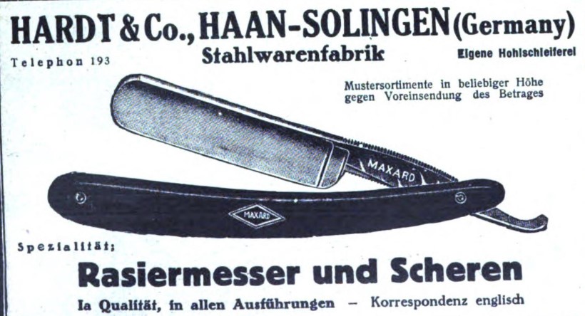 Данная бритва принадлежит и изготовлена фирмой "Hardt & Husain", Solingen вот реклама из журнала Das Echo №46 за 1927 год: На фото четко просматривается рисунок на полотне и название на сорочке ( Hilal ), которые полностью совпадают с теми, что на бритве: (увеличил бритву) Spoiler Show Spoiler Show Затем он с индусом основал фирму "Hardt & Husain". В гугле нашелся фрагмент статьи из журнала "Экспорт стальной продукции Золингена в Британскую Индию, Бирму" за 1934 год (Die Ausfuhr Solinger Stahlwaren nach Britisch-Indien, Burma):