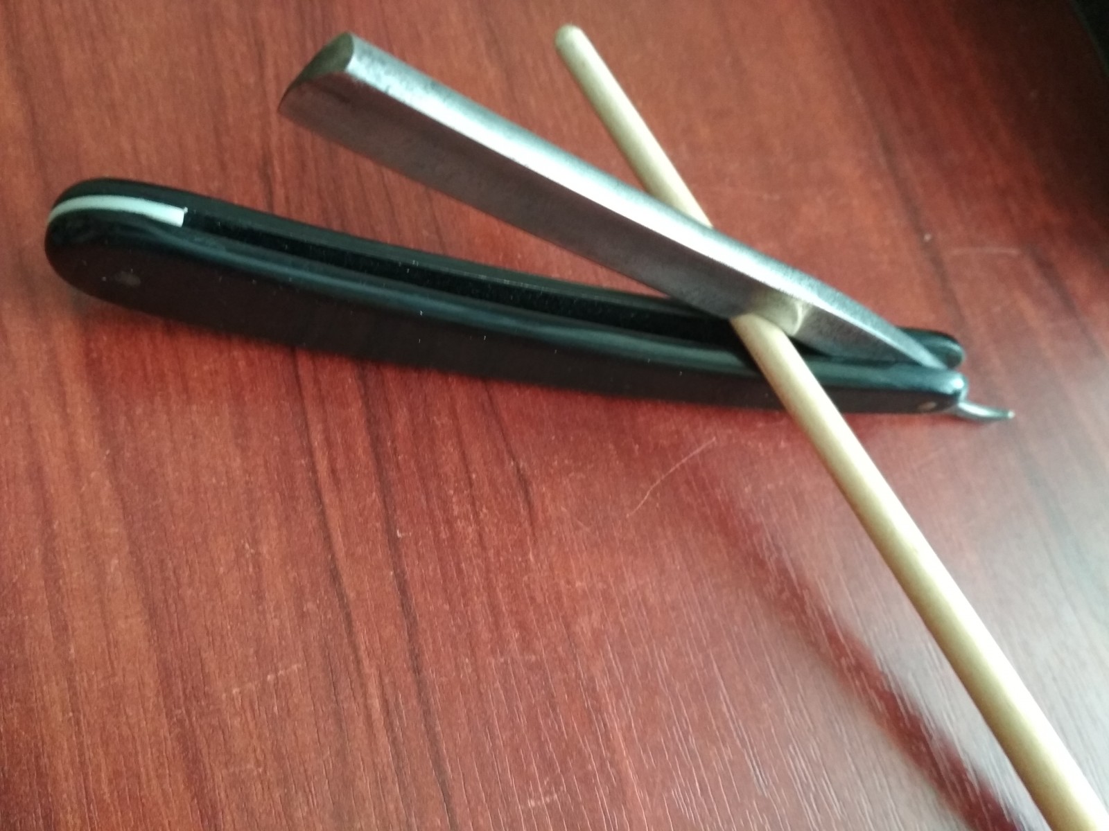 Ручка пластмас, массивная, штифты медь. Надписи на лезвие постарался передать максимально точно, но неуверен. Кто знает как улучшить их считываемость поделитесь. Спасибо заранее. Добавлено спустя 1 минуту 27 секунд: Ещё пару фоток