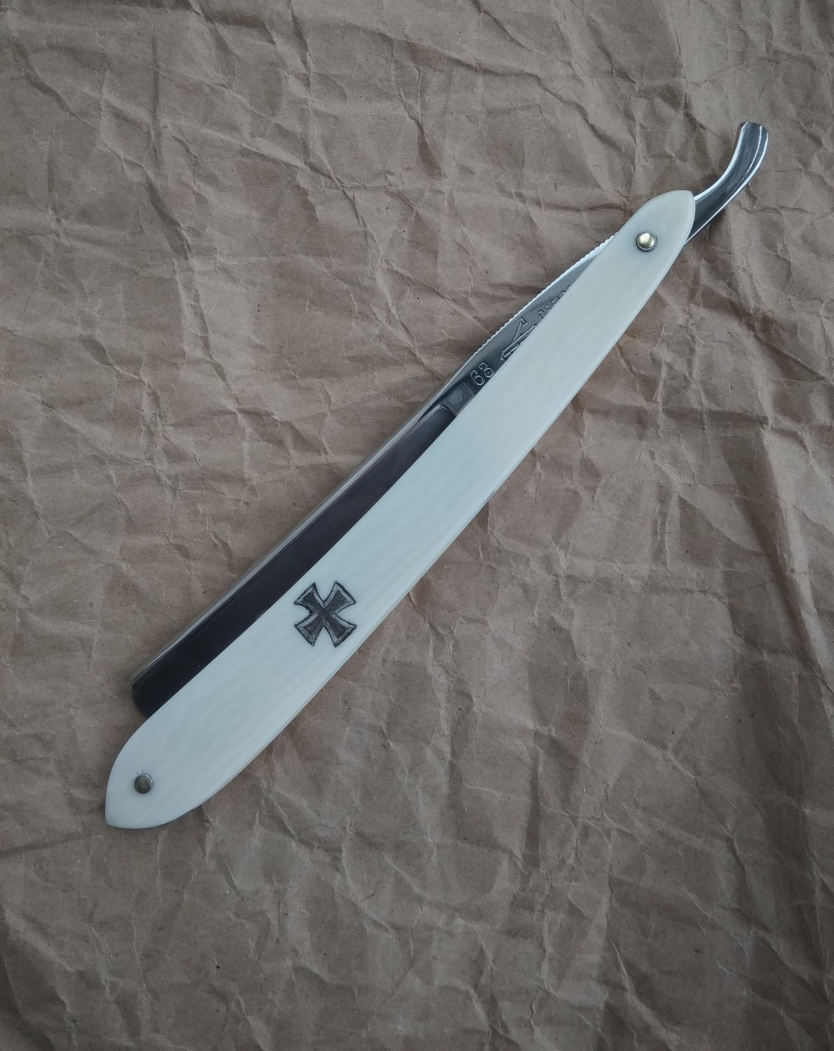 Клинок 6/8 с травлением и уквадрачиванием носика. Оправа - слон, с какой то винтажнее бритвы с оловянным клинышком (подарок Вига). Скримшоу железного креста. Пины - латунь. Шайбы какие-то белые.