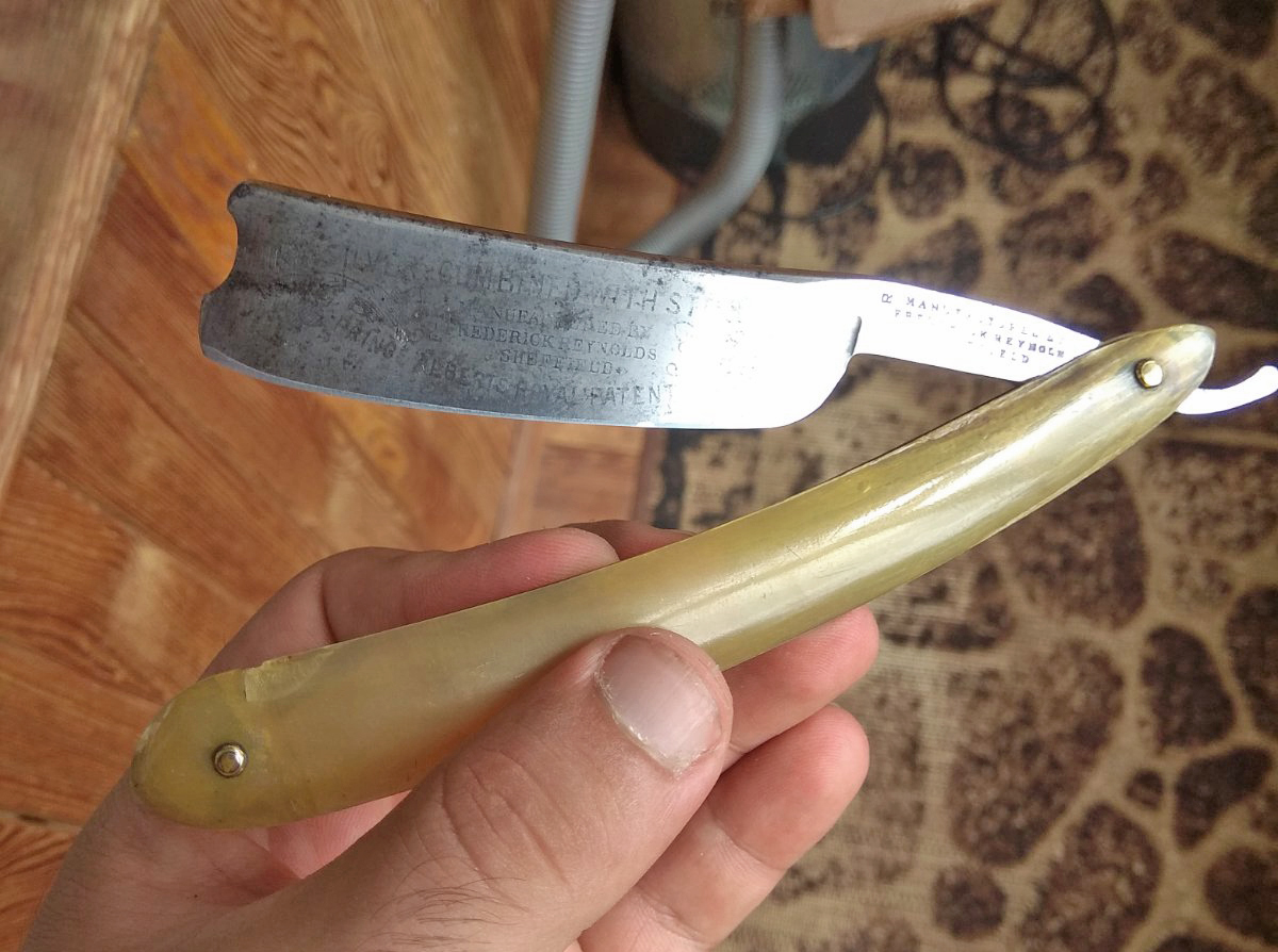 "Frederick Reynolds", Sheffield. (!*)Лежала несколько лет, совершенно новая бритва. Изрядно выпив, решил заточить. Уронил. В итоге трещина 10мм. С тех пор, уже лет 10 не точу под мухой.