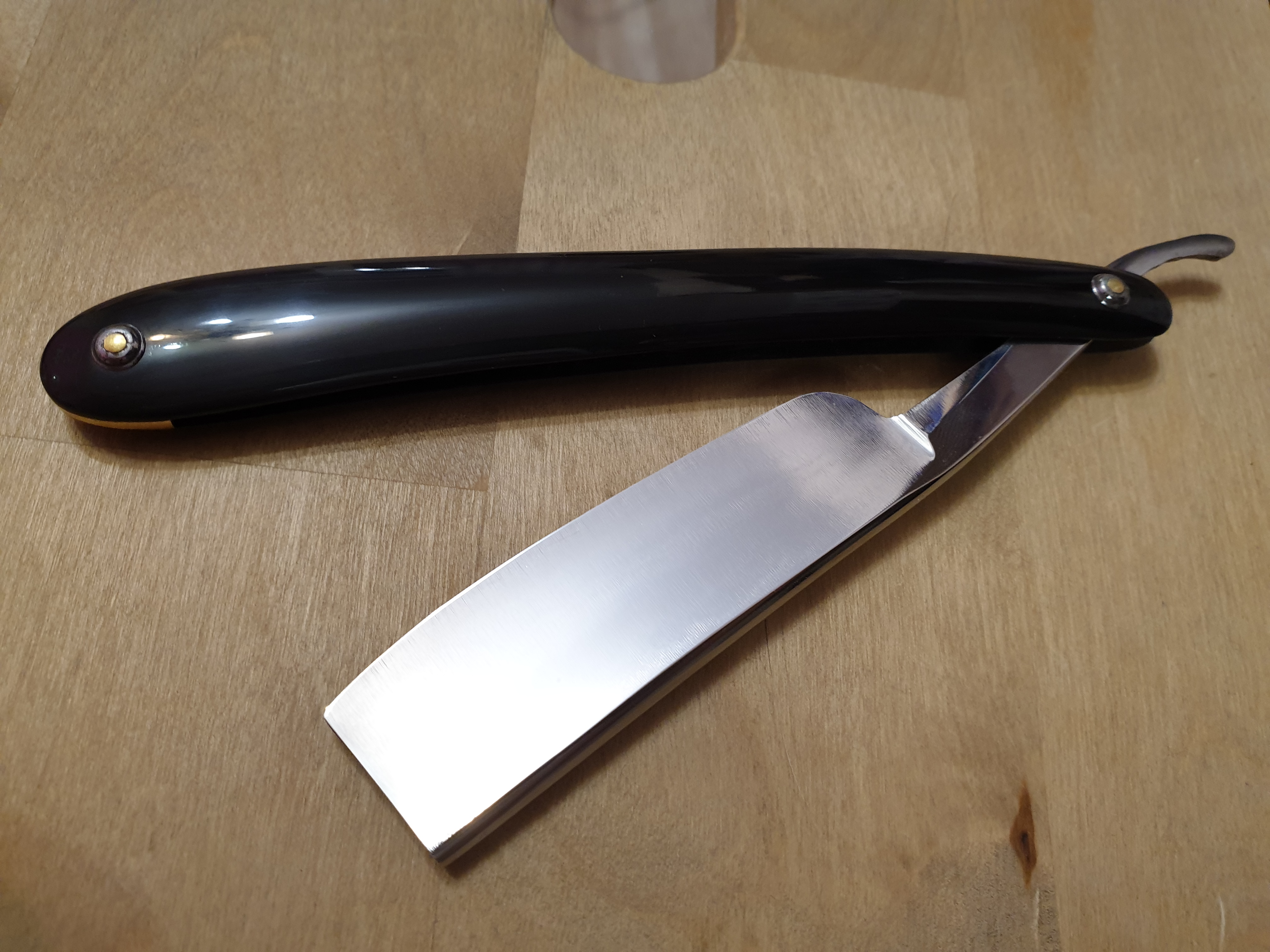 Насколько я знаю, это старая английская бритва из Шеффилда. По словам продавца, это конец 19 века. Но почему она такая "толстая", семь с небольшим мм, я имею в виду толщина обуха? Интересует примерный возраст и стоимость. Рукоять из рога, всего одна небольшая трещинка у пина. Да и вообще, накидайте информации побольше!