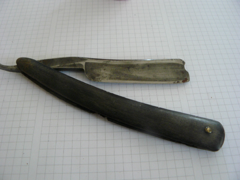 Насколько я знаю, это старая английская бритва из Шеффилда. По словам продавца, это конец 19 века. Но почему она такая "толстая", семь с небольшим мм, я имею в виду толщина обуха? Интересует примерный возраст и стоимость. Рукоять из рога, всего одна небольшая трещинка у пина. Да и вообще, накидайте информации побольше!