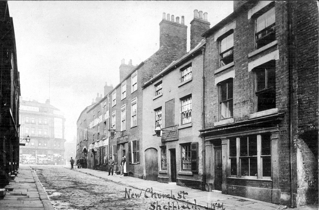 Улица New Church, которая была потеряна, когда был построен Town Hall в 1890-х годах. © Фото Sheffield