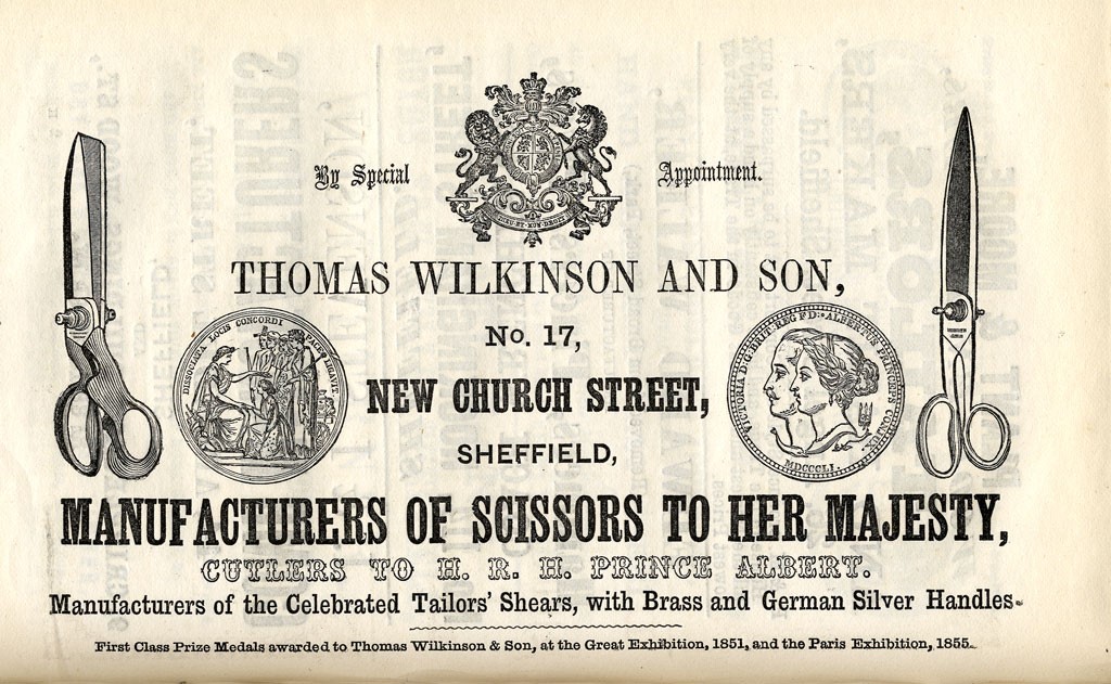 Первая запись о Thomas Wilkinson была в 1822 году, когда он работал на улице Meadow. Эта компания представила королеве Виктории пару украшенных декоративных ножниц с эмалью в 1838 году и получила королевский ордер от королевы Виктории и принца Альберта 16 октября 1840 года. К 1845 году бизнес переместился на улицу New Church, а сын Томаса(Thomas) - George присоединился к бизнесу и сделал свою марку. Имея репутацию, получили королевское поручение и George помог организовать павильон Sheffield на Великой выставке в 1851 году. Thomas Wilkinson & Sons выиграли медаль за показ ножниц на Великой выставке, в которую вошли копии ножниц, выполненных для королевского двора, включая презентационную пару 1838 года. В 1875 году компания по производству ножниц William Whiteley & Sons приобрела этот бизнес; William Whiteley по-прежнему производит ножницы сегодня в современном подразделении в Holbrook. реклама Show