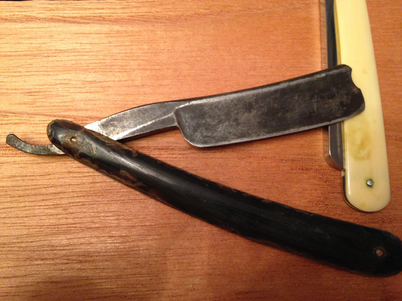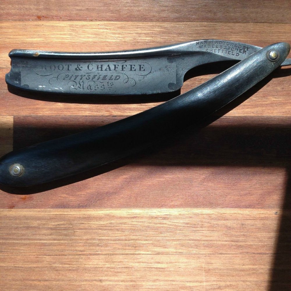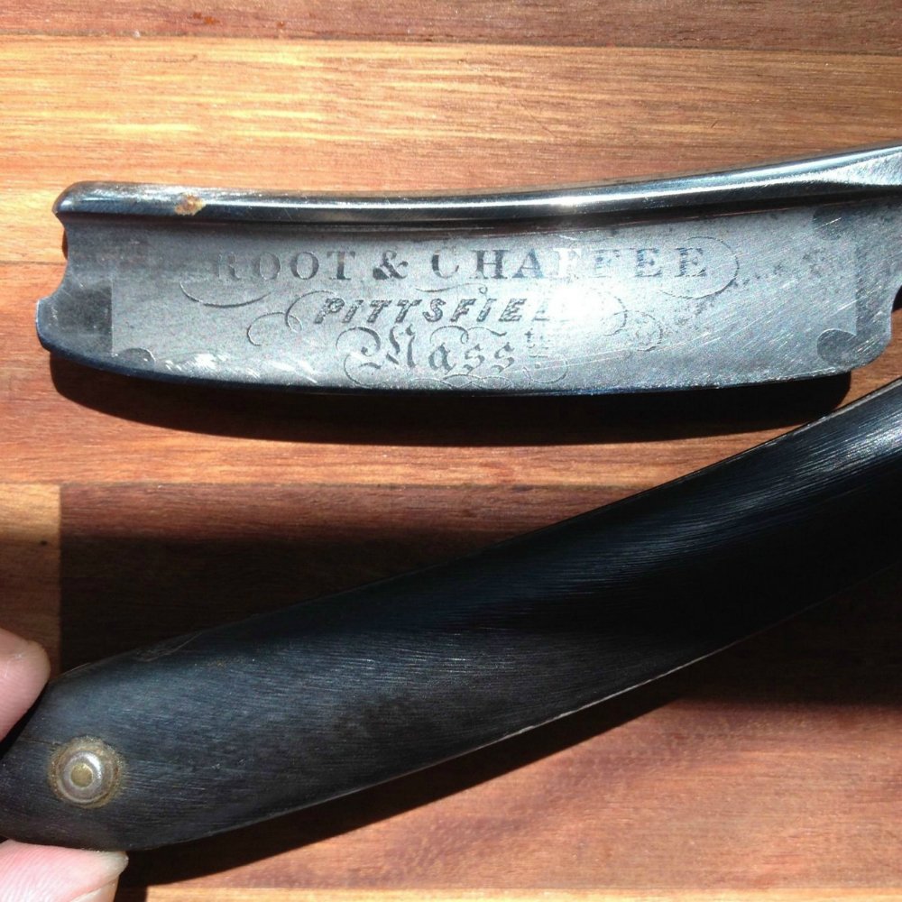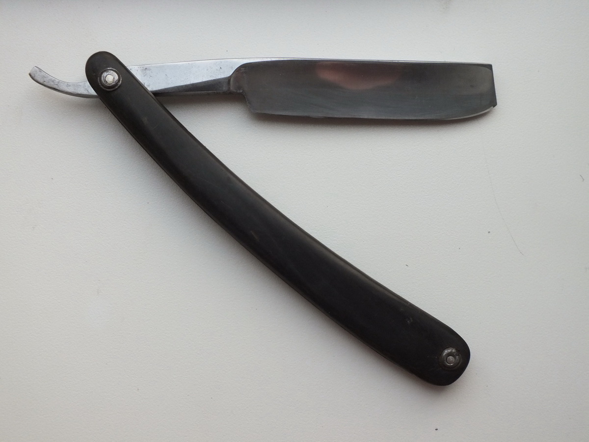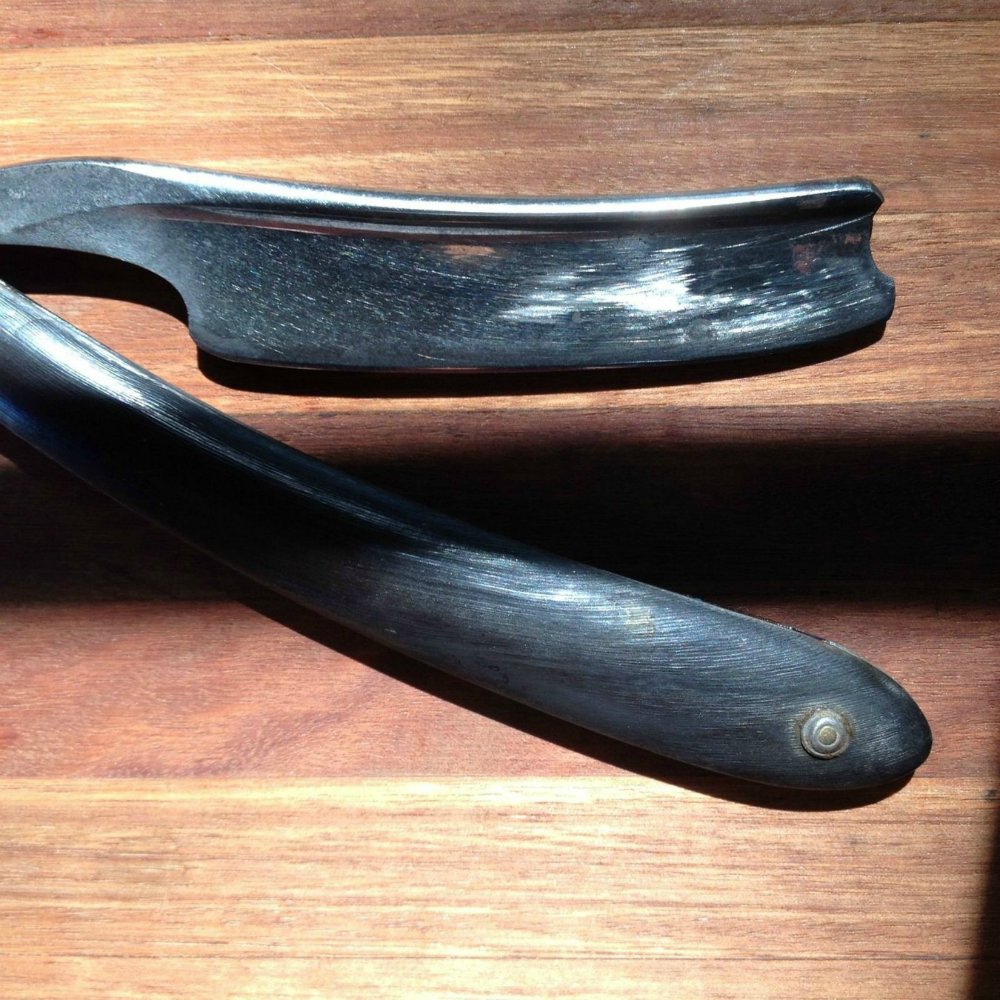 Насколько я знаю, это старая английская бритва из Шеффилда. По словам продавца, это конец 19 века. Но почему она такая "толстая", семь с небольшим мм, я имею в виду толщина обуха? Интересует примерный возраст и стоимость. Рукоять из рога, всего одна небольшая трещинка у пина. Да и вообще, накидайте информации побольше!