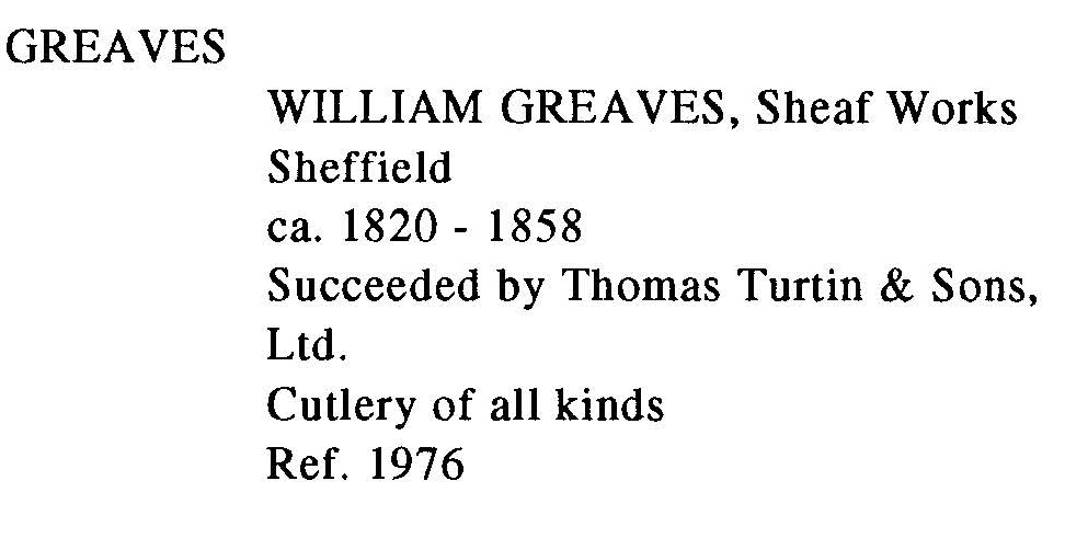 Основателем был Уильям Гривз (ок. 1752-1830), сын Роберта Гривза, точильщика столовых приборов из Станнингтона. Уильям поступил в ученики к ножовщику Джозефу Уорроллу и получил свободу в 1776 году. В следующем году он женился на Энн Палфриман (ок. 1752–1824). У пары было десять детей, из которых выжили два сына и пять дочерей. Уильям Гривз специализировался на бритвах и был зарегистрирован на Берджесс-стрит в 1787 году (торговая марка GREAVES). Сообщалось, что к 1797 году он «немножко торговал на Чейни-сквер» [недалеко от церкви Святого Павла] и, по-видимому, часто посещал трактир на Малберри-стрит («Шеффилд Индепендент», 25 января 1873 г.). К 1801 году его сыновья - Эдвард (ок. 1778-1846) и Ричард (ок. 1780-1835) - присоединились к фирме, которая стала называться William Greaves & Sons. Затем он переехал в помещение в Холлис Крофт (позже занятоеДжозеф Эллиот ), а затем на Дивизионную улицу.