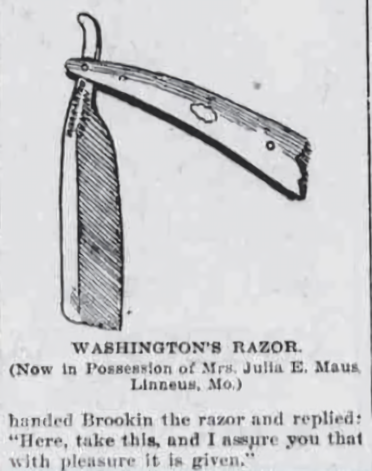 Столетие со дня смерти Джорджа Вашингтона вызвало тот факт, что жительница штата Миссури, миссис Джулия Э. Маус из Линнеуса, является обладательницей! о бритве, которая была собственностью отца его страны во время революции и которой он в последний раз пользовался утром после битвы при Брэндивине, сообщает газета St. Louis Republic.