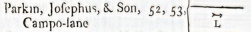 The family came from Howbrook, near Wortley. Joseph Parkin was Master Cutler in 1752. His sons included Josephus (c.1732-1812), James, and John (Clay, vol. IV, 18961). Apparently, Josephus purchased his Freedom in 1755. However, Parkin was a common name in the Sheffield cutlery trades and following this branch of the family in directories is confusing. Josephus Parkin appeared in the Sheffield directory (1774) as a cutler in Silver Street (one of a network of streets near the parish church). Josephus’ trade mark was an arrow head and the letter ‘L’. In the same directory, Parkin & Son was a manufacturer of razors and pen knives in nearby Campo Lane (trade mark ‘HOLLAND’).