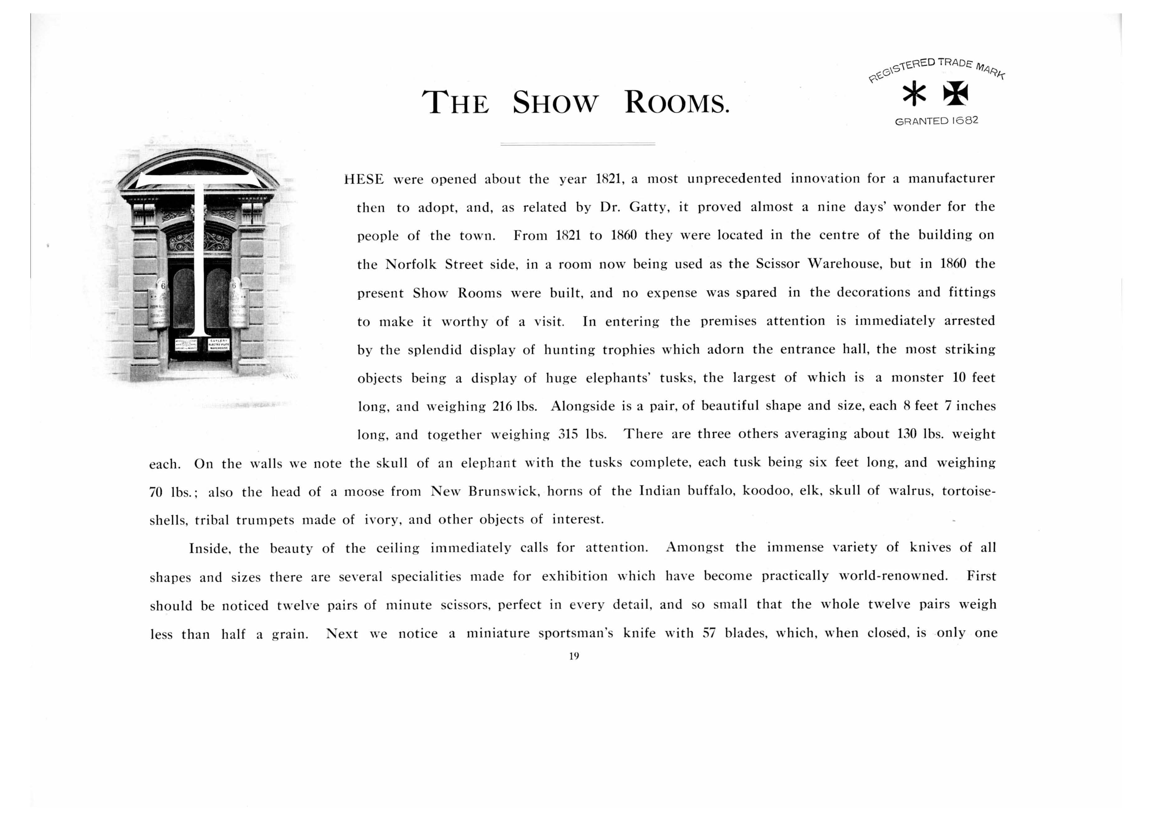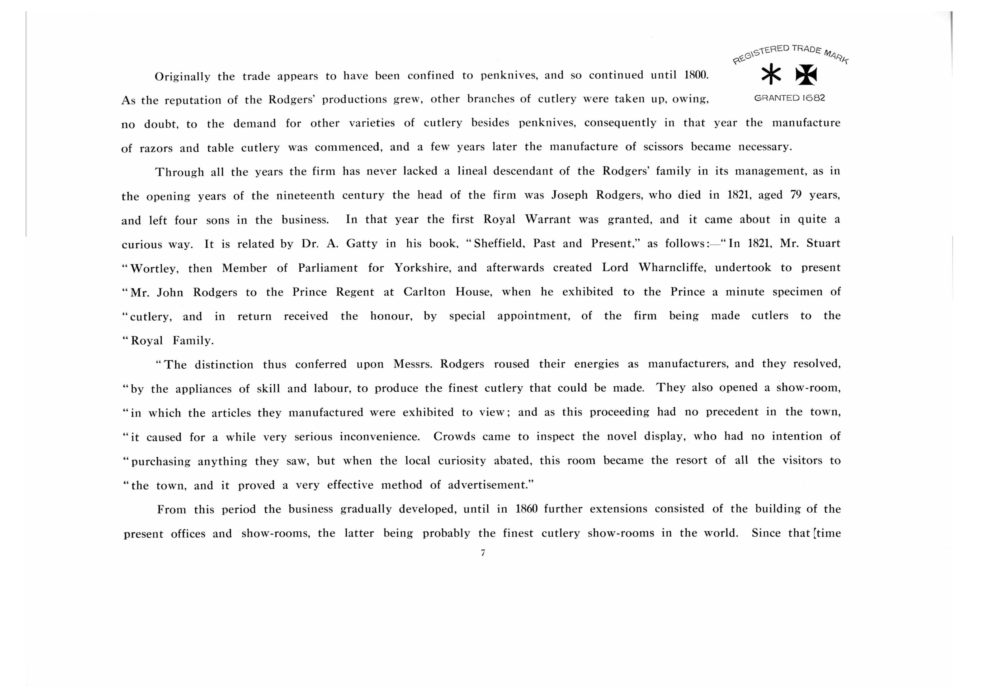 "… На сегодняшний день (1871 год - прим.авт.) эта фирма имеет около 1700 рабочих, которые были выучены на профессиональном уровне и изготовляют каждую неделю приблизительно 5000 дюжин кухонных приборов, 1500 дюжин карманных ножей, 1200 дюжин бритв и 1200 дюжин ножниц. Фирма имеет свою контору и склад на Cullumn Street, Fenchurch Street в Лондоне, а так же в Нью-Йорке, Монреале, Торонто и Новом Орлеане. Основными направлениями продаж являются Соединенные штаты, Индия, Южная Америка, Канада, Австралия, Южная Африка, а также местный рынок. Обьем продаж в Америке огромен. В 1870 году сюда было послано более 10 тонн ножевого товара…".