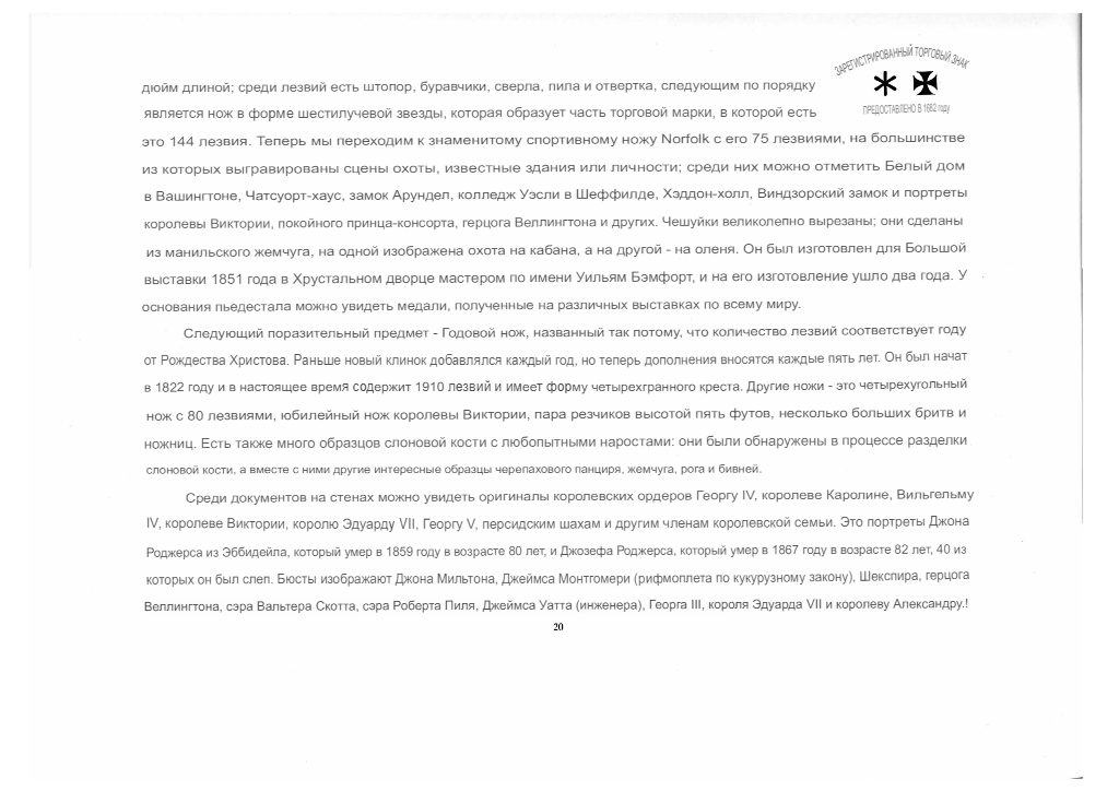 "…На стальных лезвиях вытравлены портреты Ее величества, принца-консорта, президента США, а так же рисунки Виндзорского дворца, американского Белого дома, Catsworth House, Haddon Hall и иных интересных мест.