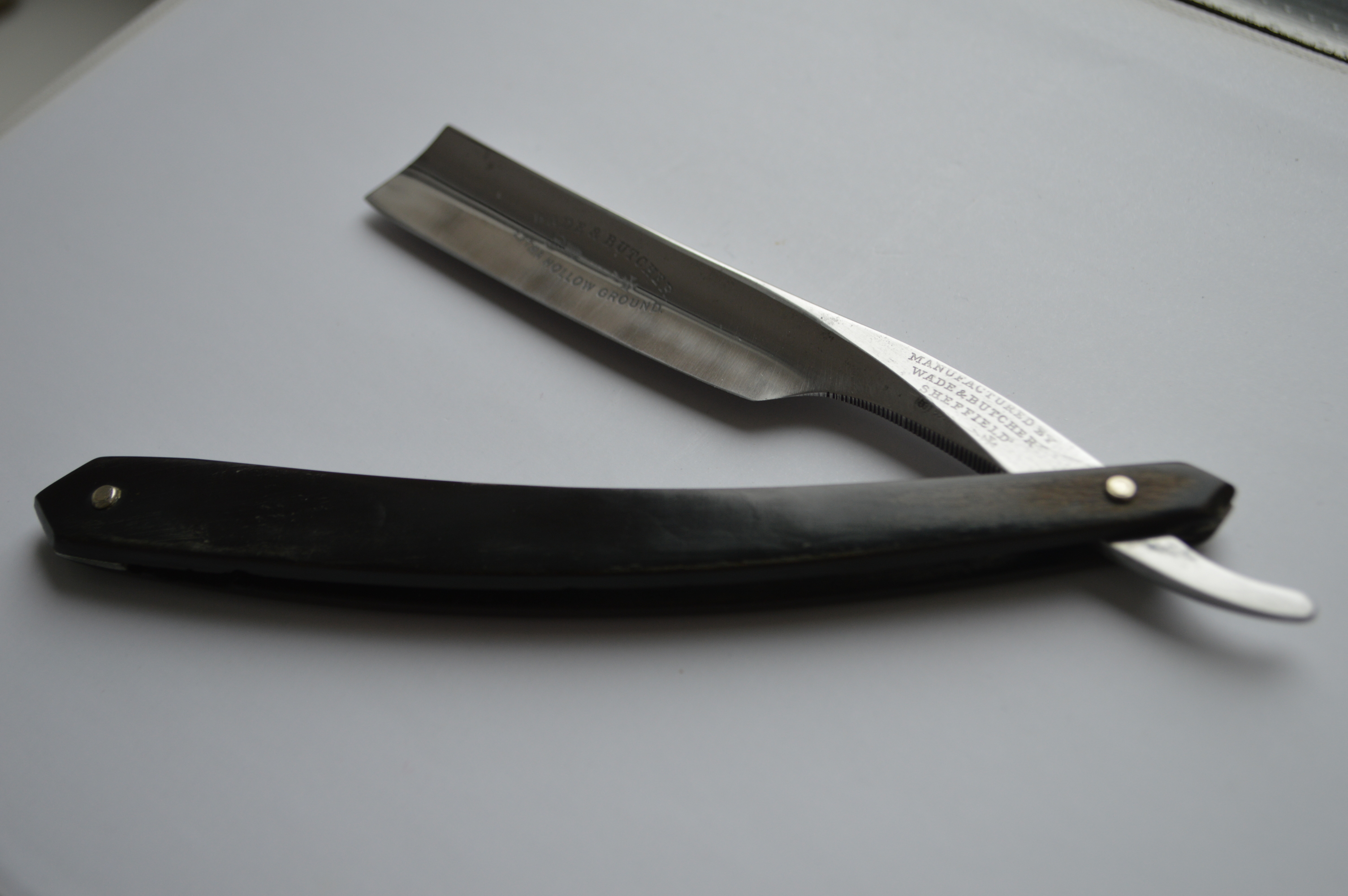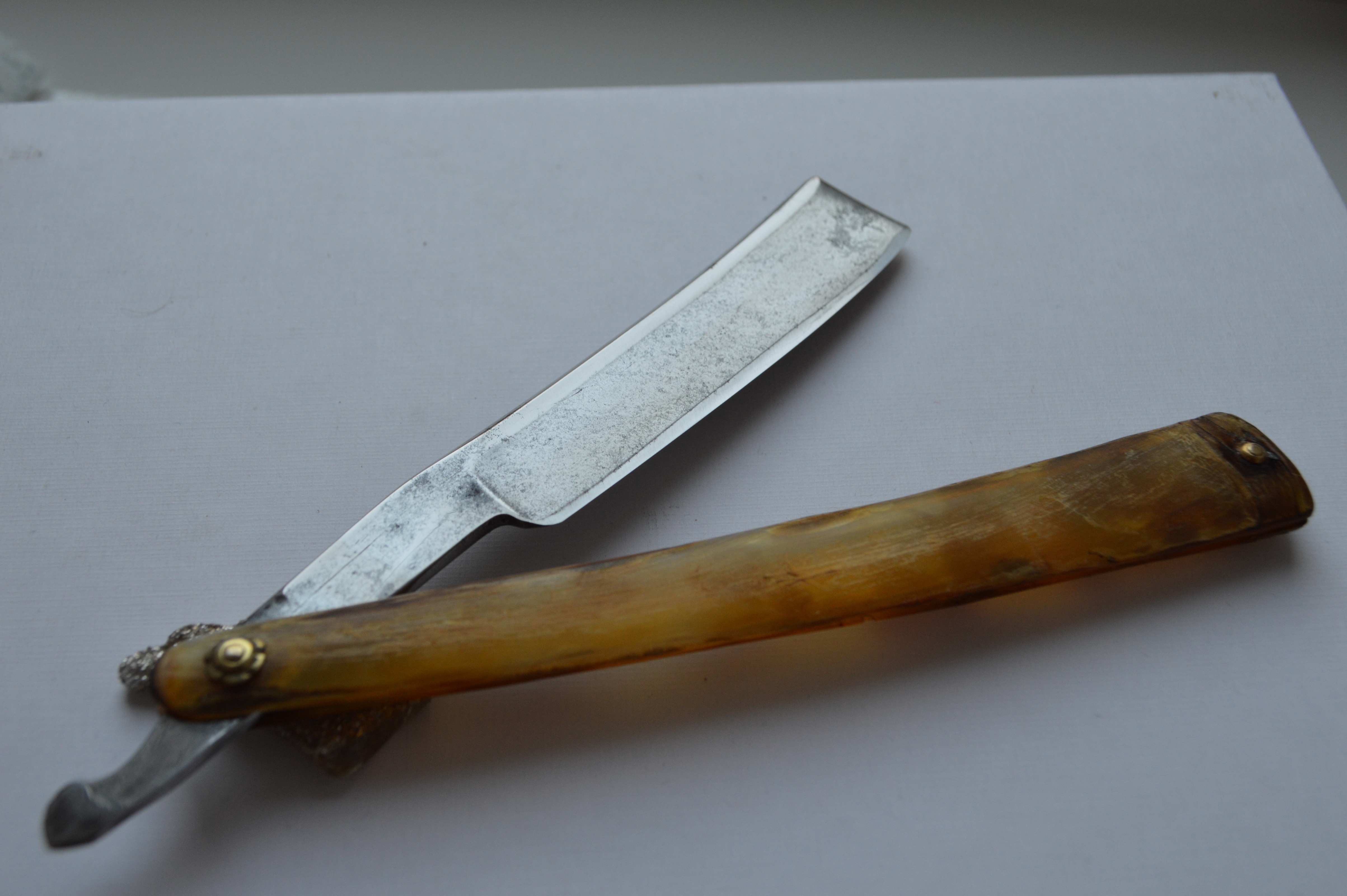 Насколько я знаю, это старая английская бритва из Шеффилда. По словам продавца, это конец 19 века. Но почему она такая "толстая", семь с небольшим мм, я имею в виду толщина обуха? Интересует примерный возраст и стоимость. Рукоять из рога, всего одна небольшая трещинка у пина. Да и вообще, накидайте информации побольше!
