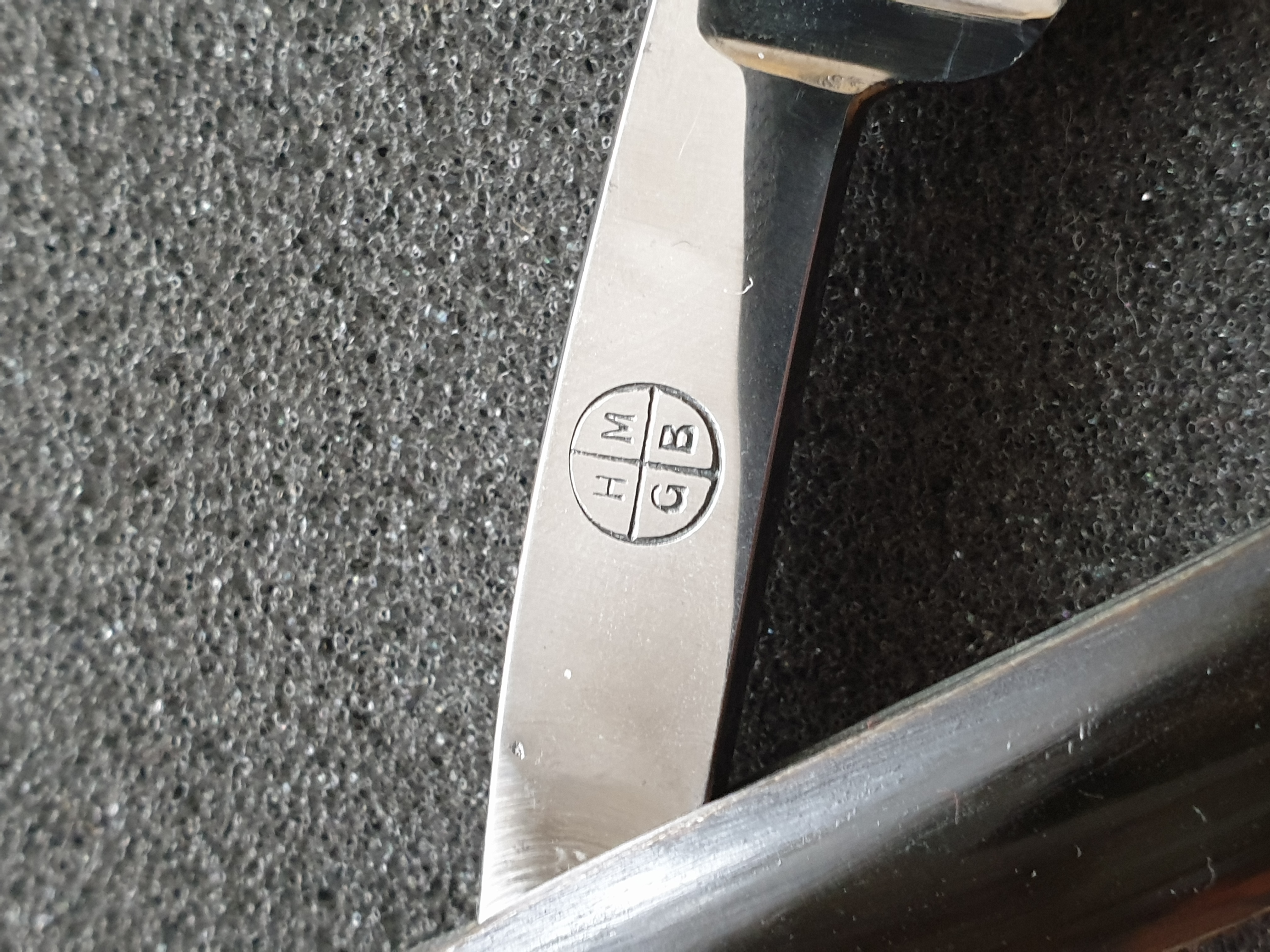 Заполучил интересный холлоу-граунд Bengall с необычным клеймом на второй стороне эрля - четыре буквы внутри расчерченного крест-накрест круга. Есть у кого какие соображения - что они обозначают? Предполагаю, что GB - это Great Britain, а в целом клеймо - морская или армейская аббревиатура. С другой стороны, бритва приехала из Швеции, возможно это "шведский" Бенгалл, который Maskinffar A-BOL.Borlänge