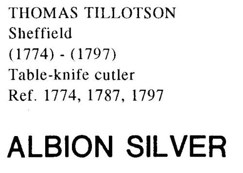 Томас Тиллотсон, основатель этого бизнеса, родился в Гейнсборо и был связан браком с семьей Питера Сперра. К 1774 году он находился на Ламберт-стрит, но к 1781 году переехал на Колпит-лейн (Кембридж-стрит). Его фирма специализировалась на столовых ножах под торговой маркой ALBION. Томас Тиллотсон стал мастером Катлером в 1789 году. Он умер 26 октября 1803 года и был похоронен на кладбище Святого Петра (Дерби Меркьюри, 3 ноября 1803 года). У него была большая семья, в которую входили четверо сыновей — Джордж, Джон, Томас и Уильям (Клэй, 1894—1896). Семья Томаса была крещена в церкви Святого Петра, и, собрав воедино информацию из ее регистров (и используя даты крещения в качестве косвенного показателя рождения), даты жизни братьев, по-видимому, были: Джон (1765-1838), Томас (1769-1797), Уильям ( 1774-1798) и Джордж (1778-1825). Их ученичество (и свободы) в качестве ножовщиков можно проследить у Лидера (1905-06): Джон (Свобода 1787), Уильям (1788), Томас (1791) и Джордж (1798). К 1797 году компания значилась как Thomas Tillotson & Sons.