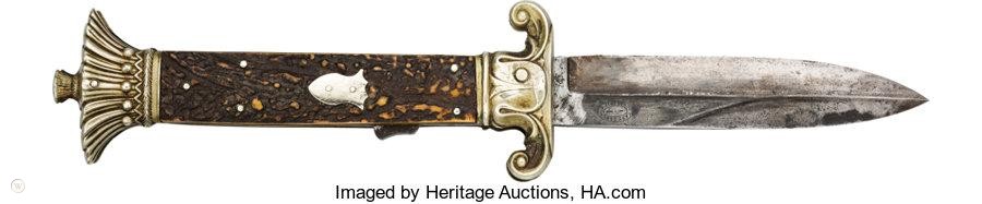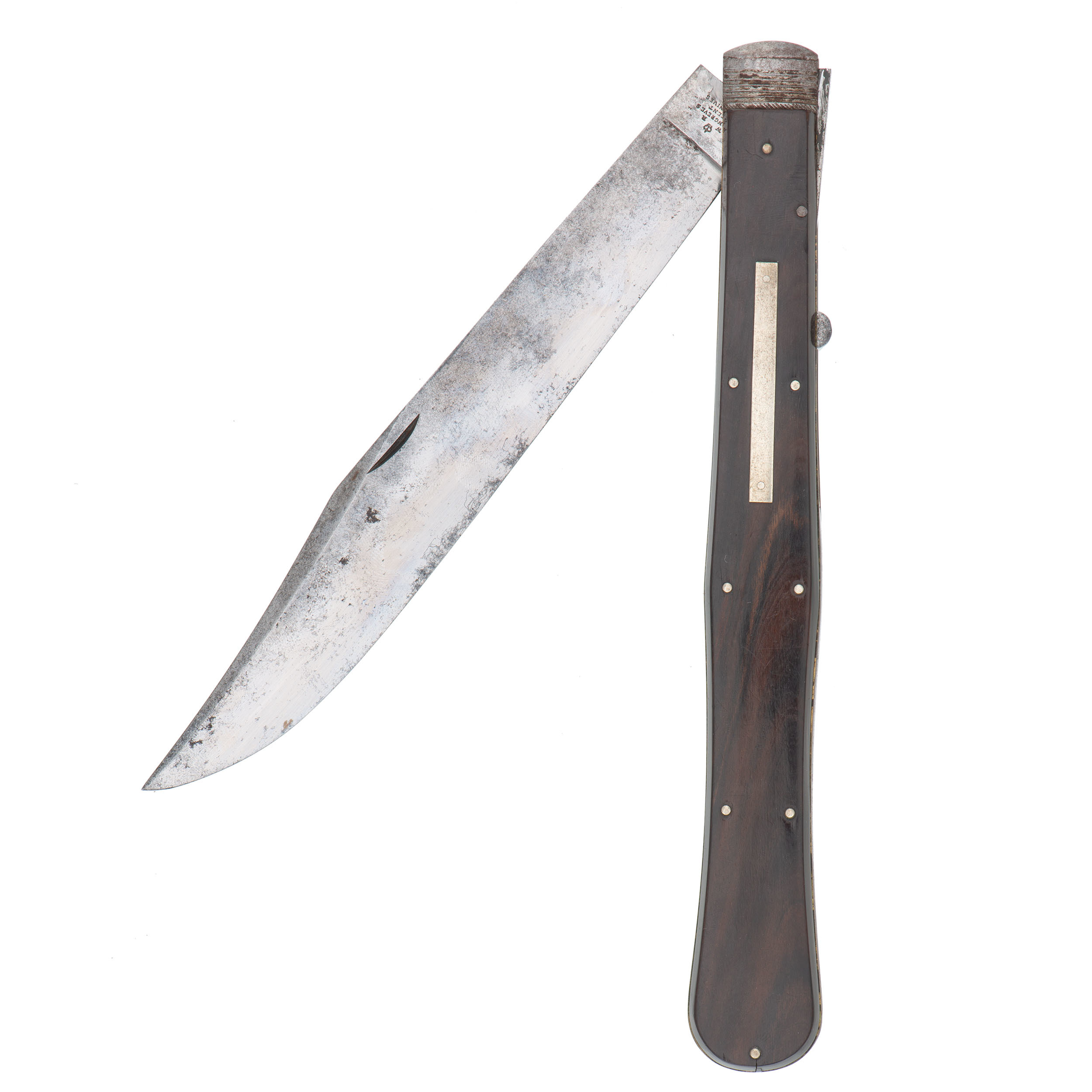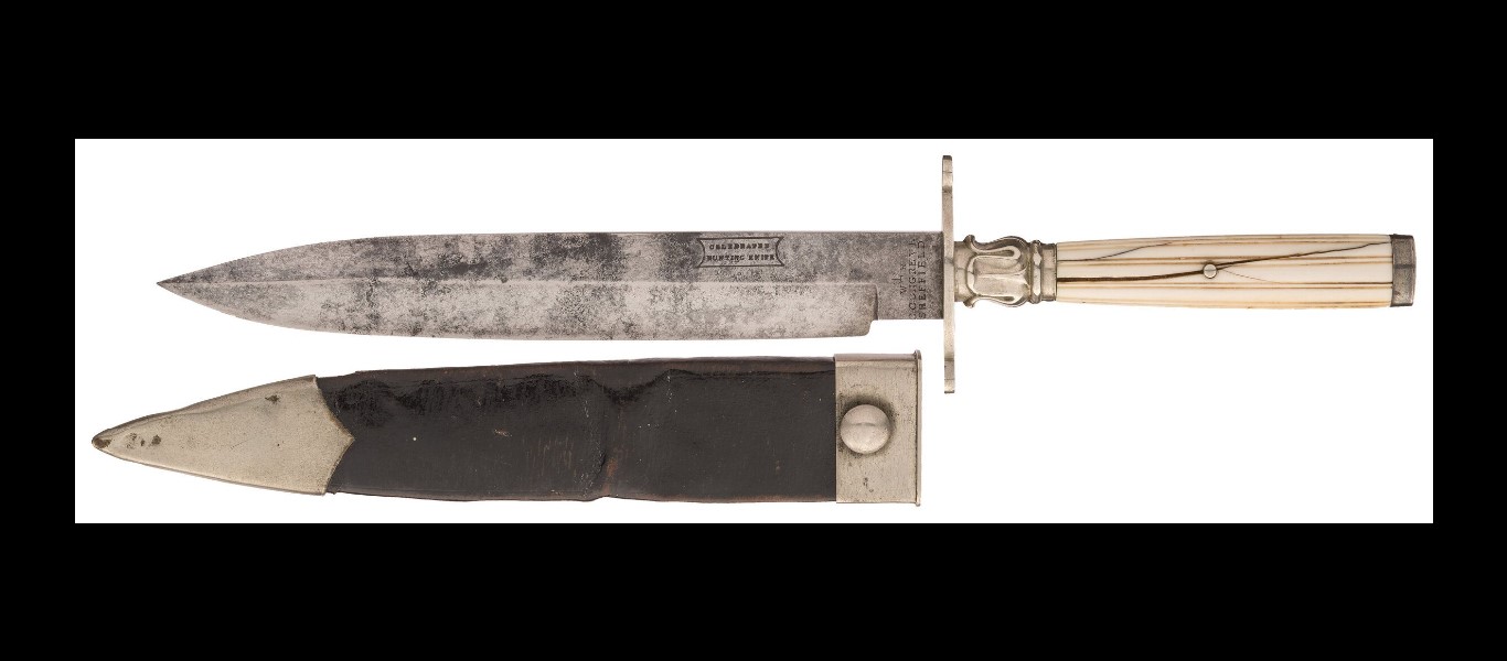 Charles Congreve was born in Sheffield on 20 March 1799, the son of William (a grinder) and Jane Congreve. He worked as a bookkeeper and became a founding partner of Naylor, Hutchinson & Vickers (the forerunner of the Vickers’ steel combine), which traded through New York. Congreve left that partnership by 1833 to operate from Gell Street and then from Arundel Works, Arundel Street. His residence was in Upperthorpe. He became an American merchant, who made regular transatlantic trips. He sold razors, such as the one depicted in Lummus (December 19221), which has the inscription ‘made from Naylor & Co’s Celebrated Steel … Tempered by Thermometer’. An early specialism was selling folding Bowies / dirks. Many ‘Congreve’ knives were marked with the Royal Cipher ‘WR’, which (if the marks are accurate) would date the knives between 1830 and 1837. That would make Congreve one of the pioneers in the Bowie and dagger trade. According to Adams (19902), Congreve marketed ‘some of the finest folding Bowies of that era’. One fine push-button example was etched: ‘I Fear Neither Lion nor Bear nor Dragon, I Can Cut Down a Tree or Top You a Flagon’.