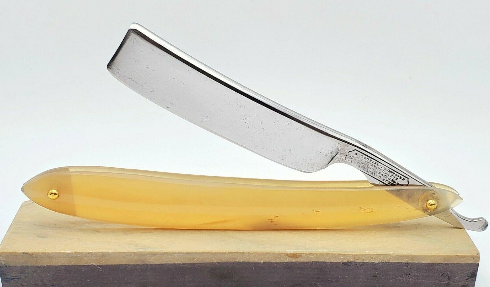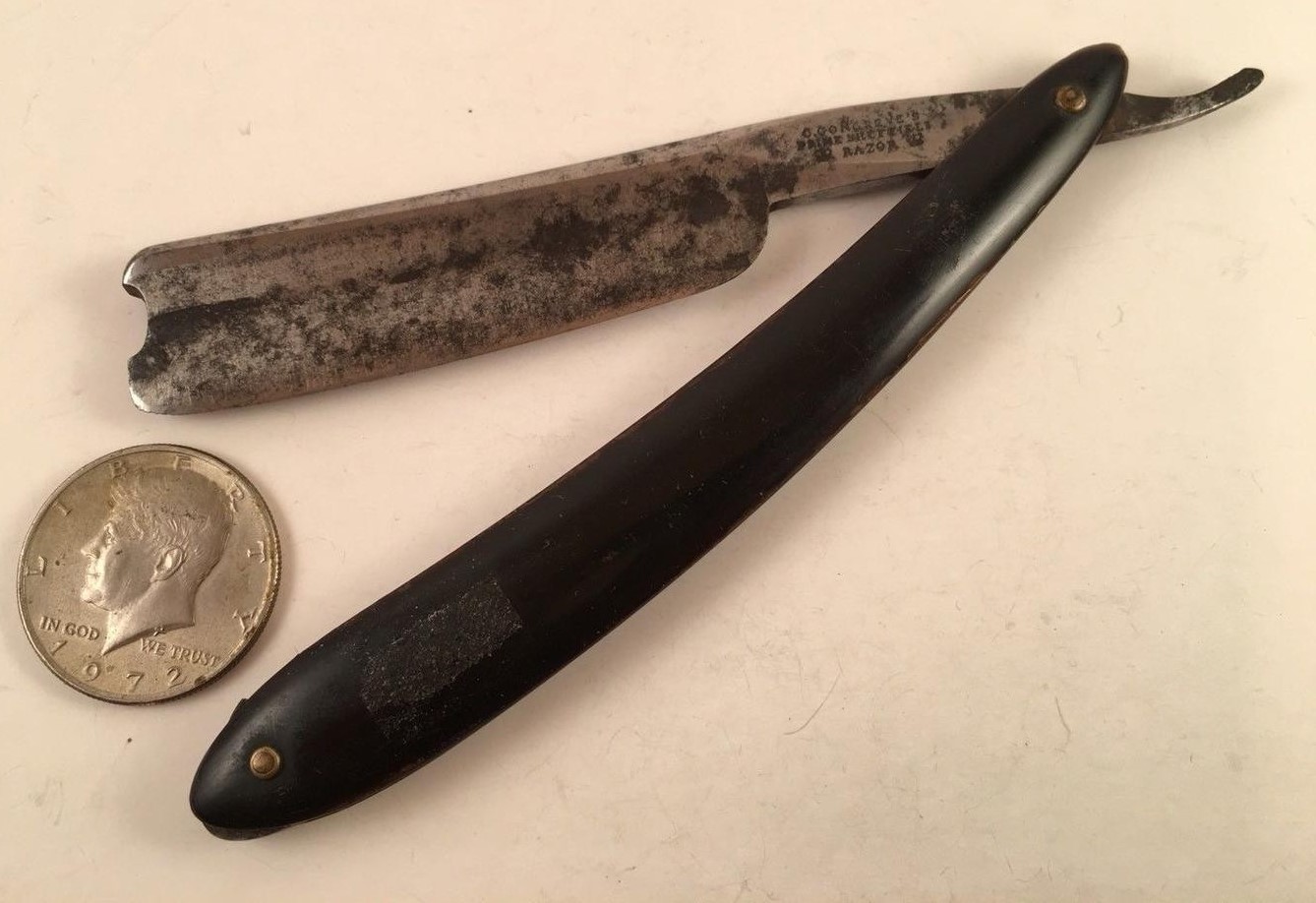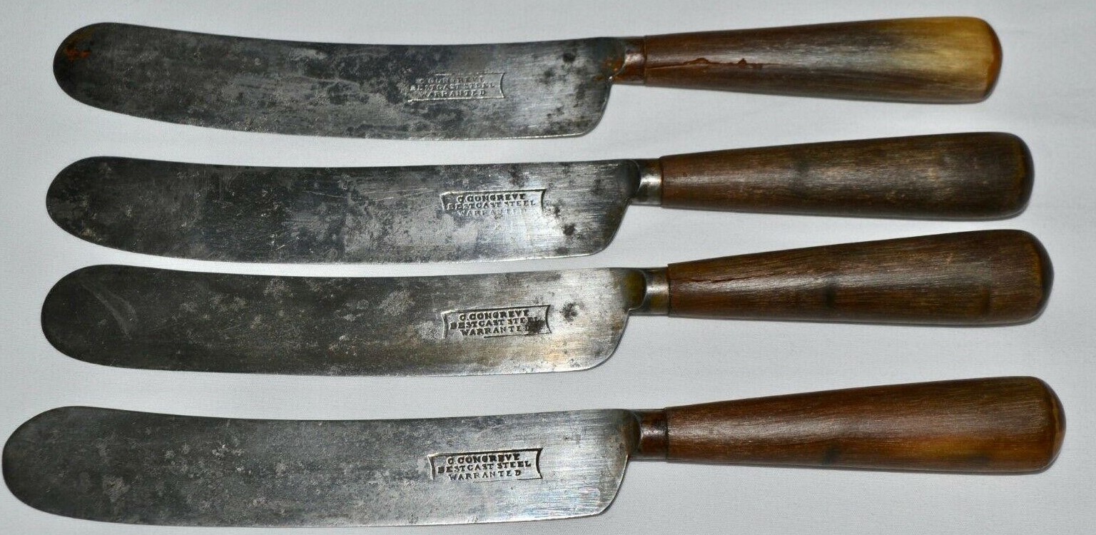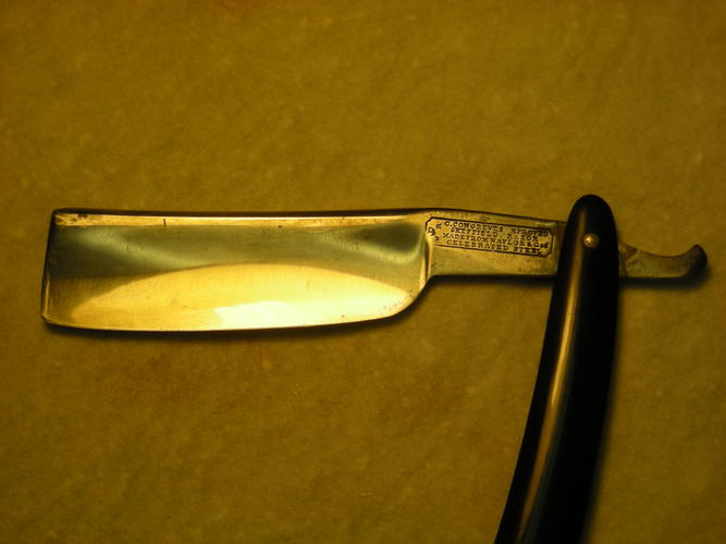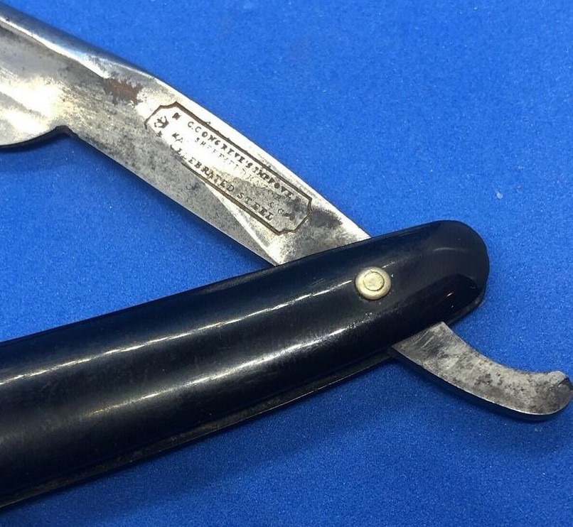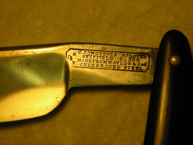 Old Sheffield Razors by Henry T. Lummus P. Дата 1830 г. Производитель,Charles Congreve, Шеффилд, 1829–1843 гг. Надписи: корона и «W. R. Патентованная американская бритва C. Congreve, сделанная из знаменитой стали Naylor & Co.», « Патентованная американская бритва C. Congreve, закаленная c применением термометра». Ручка: черный рог. Эта бритва была экспортирована компанией Naylor & Co. для рекламы своей стали в Америке. Чарльз Конгрив родился в Шеффилде 20 марта 1799 года в семье Уильяма (шлифовщика) и Джейн Конгрив. Он работал бухгалтером и стал партнером-основателем компании Naylor, Hutchinson & Vickers (предшественника сталелитейного комбината Vickers), которая торговала через Нью-Йорк. Конгрив покинул это партнерство к 1833 году, чтобы работать с Гелл-стрит, а затем с Арундел-Уоркс на Арундел-стрит. Его резиденция находилась в Апперторпе. Он стал американским купцом, совершавшим регулярные трансатлантические путешествия. Он продавал бритвы, подобные той, что изображена у Луммуса (декабрь 1922 г. 1).), на котором есть надпись «Сделано из знаменитой стали Naylor & Co… Закалена термометром». Первой специализацией была продажа складных боуи/кортиков. Многие ножи «Конгрев» были отмечены Королевским шифром «WR», который (если отметки точны) датирует ножи периодом между 1830 и 1837 годами. Это сделало Конгрева одним из пионеров в торговле боуи и кинжалами. По словам Адамса (1990 2 ), Конгрив продавал «одни из лучших складных Боуи той эпохи». На одном прекрасном примере с кнопкой было выгравировано: «Я не боюсь ни льва, ни медведя, ни дракона, я могу срубить дерево или налить тебе кувшин».