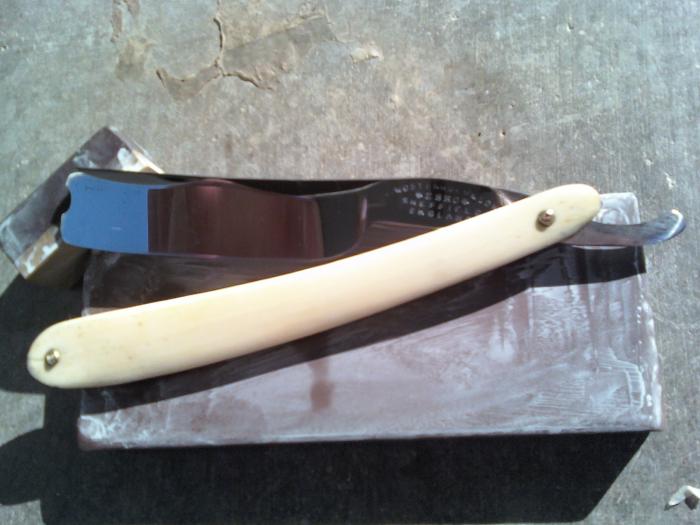 Видел клины такой формы, квартеры, вот теперь еще и 1/2 вогнутости. Да и камни конические необязательны, достаточно просто того, чтобы оси не были параллельными, да мало ли как, хотя бы даже на одном камне ее обточили, раз пустили в продажу, приделали ручку, причем не самую простую, да еще и на заводе Востенхолма. Оснований называть эту бритву браком вообще 0, тем более что заточилась и фаска равномерна. Короче форма и геометрия на 5+ Ручка так вообще самое оно. Re: Geo.Wostenholm & Son (Sheffield, England) (#)Вряд-ли рабочий, который её делал, специально так "фигурно" на камнях вышивал. Скорее всего у него нечаянно получилось. Но не пропадать же добру