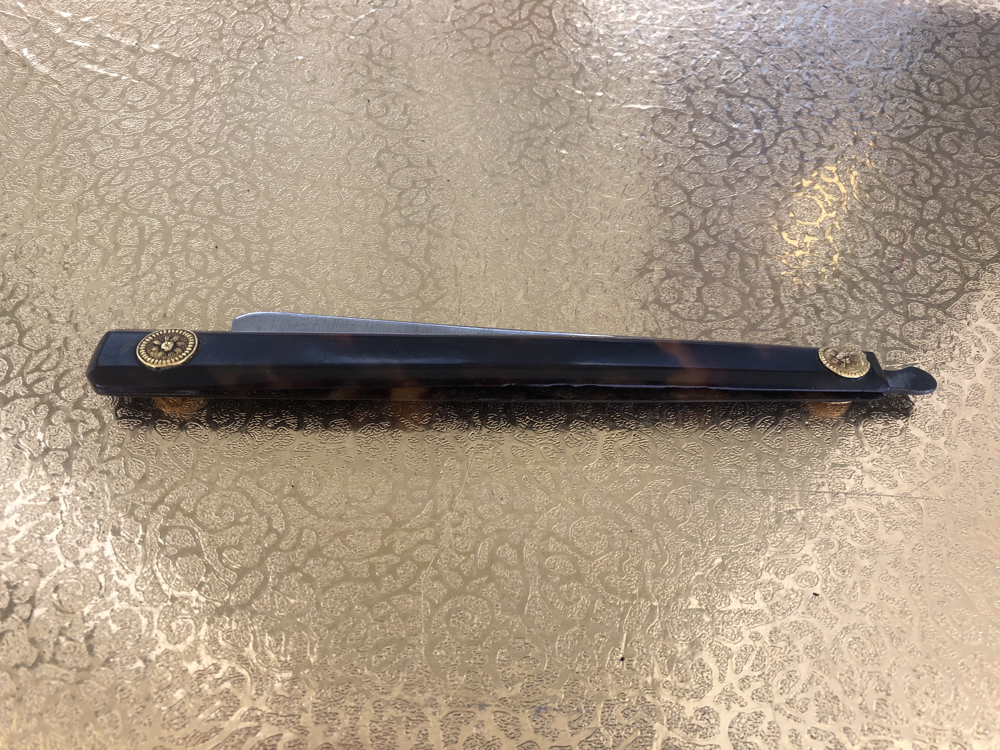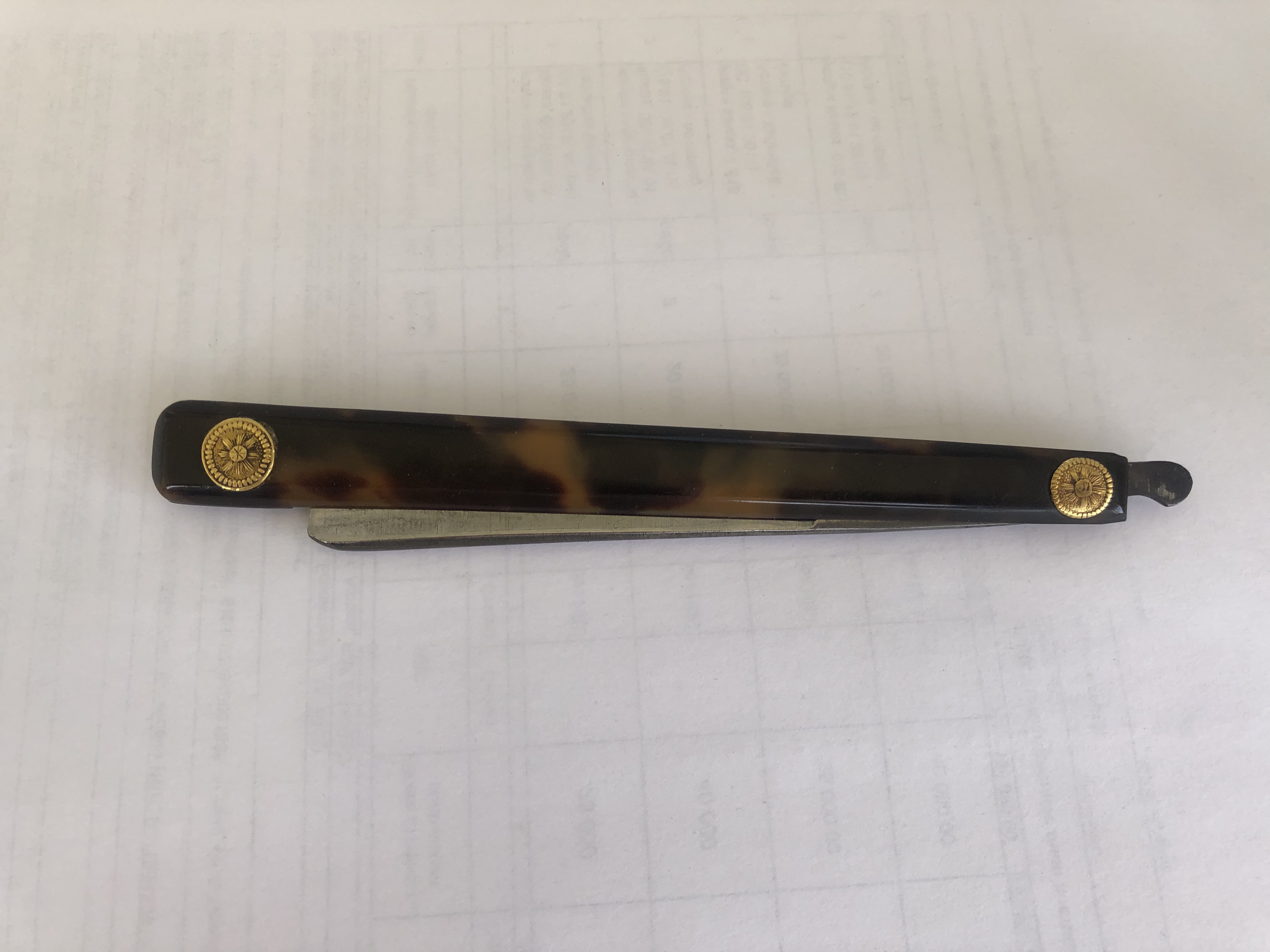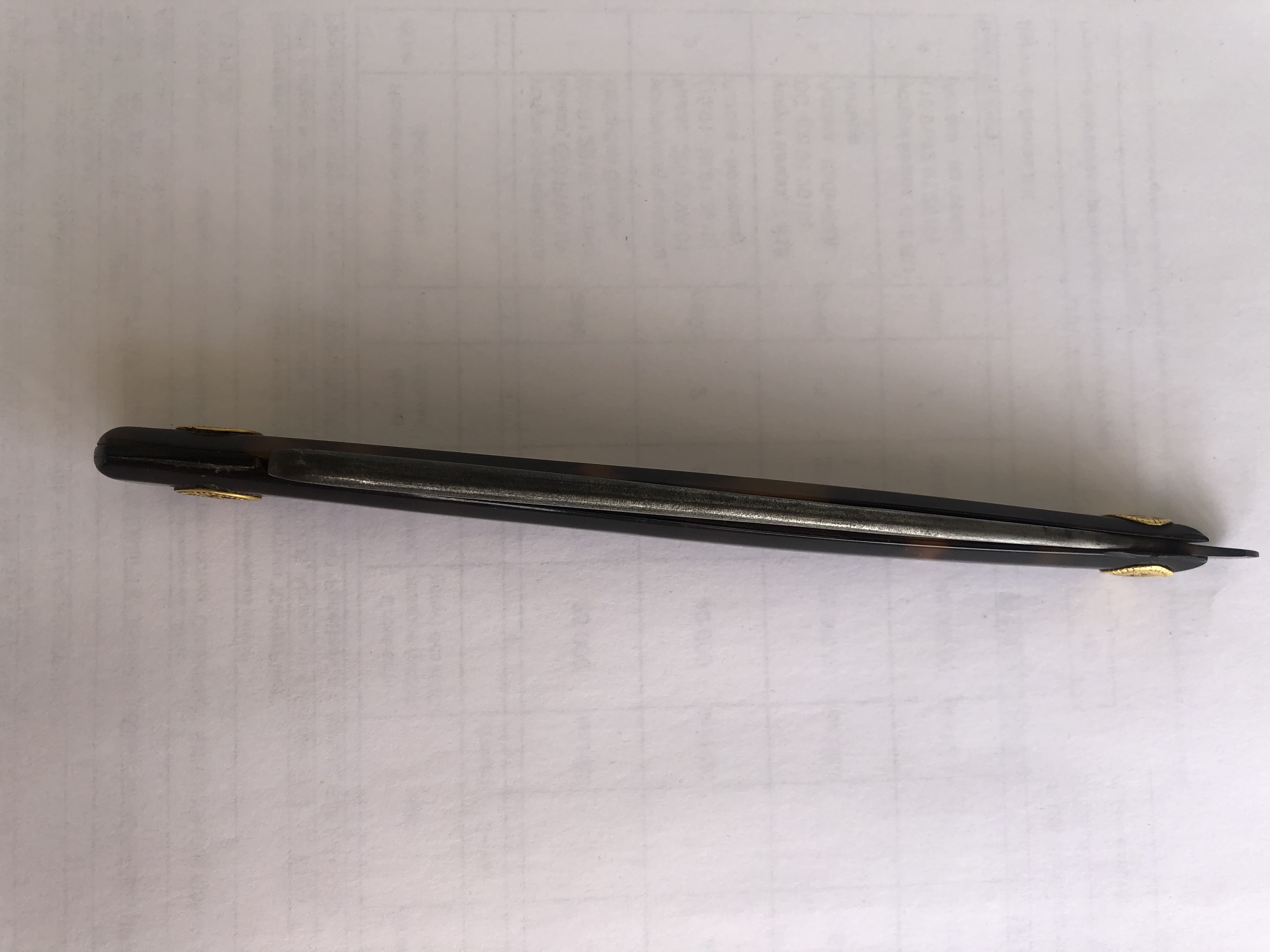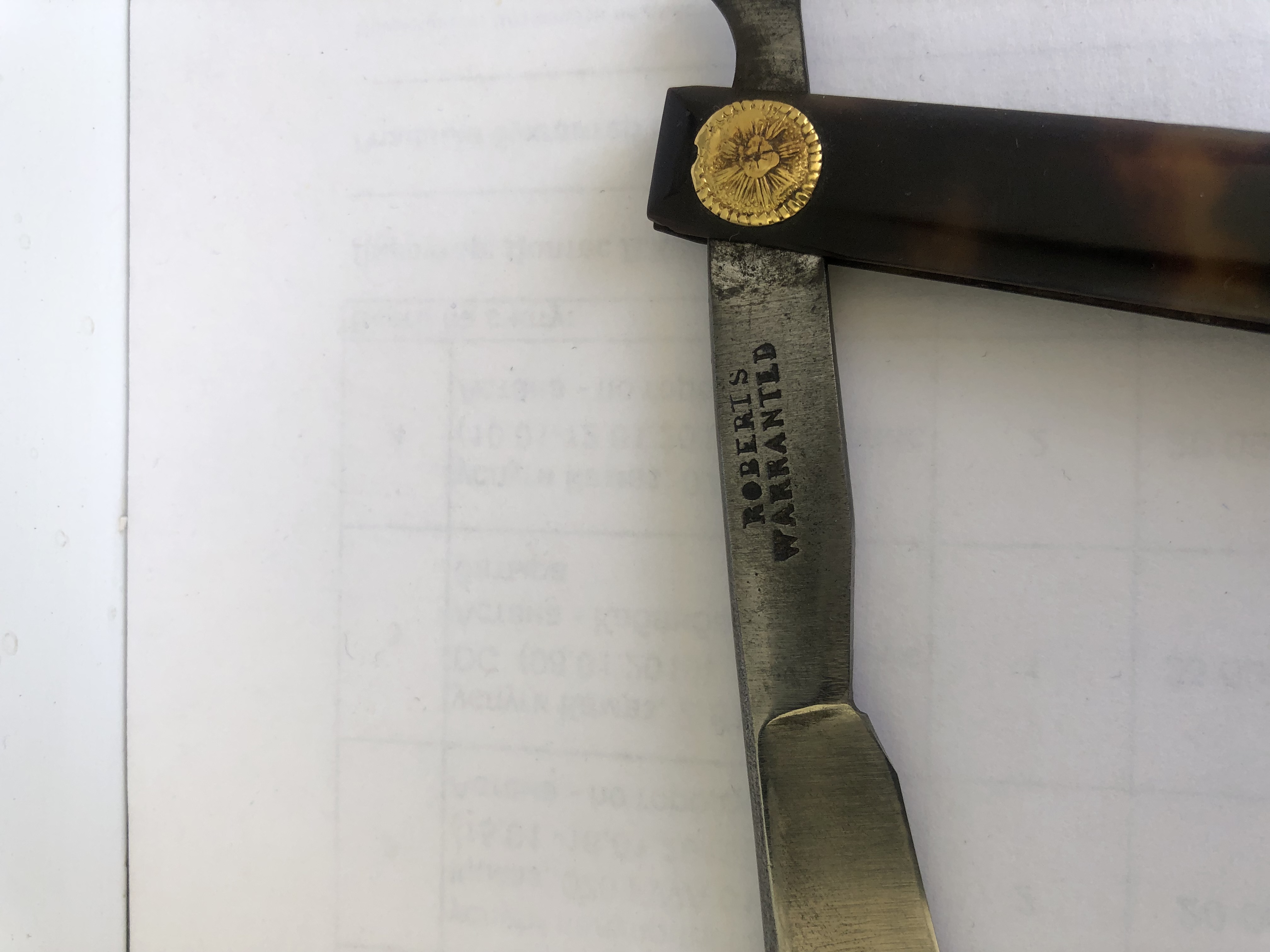 Оправа черепаха. Осевой пин скорее всего снимался, но точно не мной. А кем и когда- пусть останется тайной. Толщина обуха идёт волной. У пятки тонкий, ближе к носику начинает расширятся, на самом носике идёт на сужение. Геометрия за счёт этого просто великолепная, не надо при заточке ничего поднимать, прижимать и тд. Для заточки использовал бельгийца и тюрингийца. Сталь показалась очень мягкой. Кругов 20-30 на ббв с суспензией и ещё столько же на чистом хватило для бритья пеньков суточной щетины на щеке на сухую без какого-либо дискомфорта и покраснения. Котикул- кругов 50 и тюрингиец на финиш.