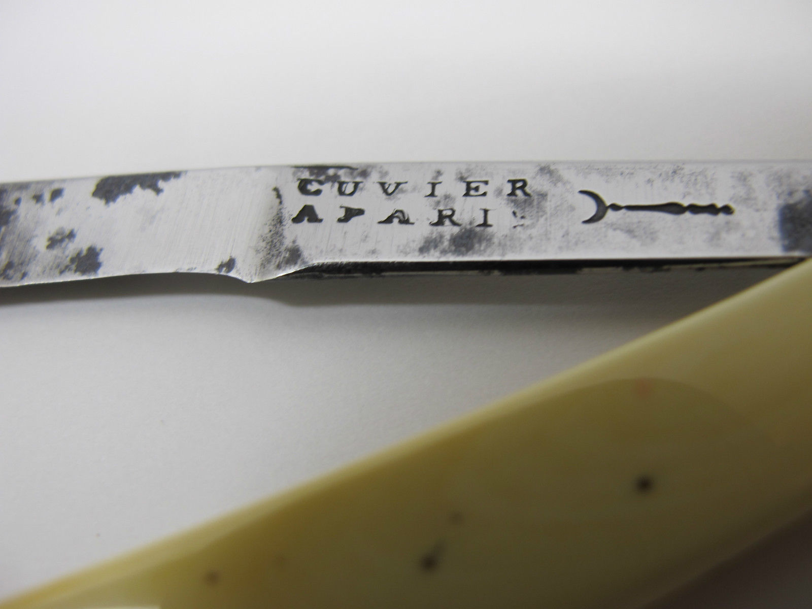 Точное название CUVIER A PARIS или CUVIER APARIS так будет точнее В Париже есть такая улица Кувье (Rue Cuvier) может это адрес был, а А это здание места производства (или тупо это адрес в таком виде (Rue CUVIER à PARIS). Но тогда эта бритва произведена не ранее 1838 так как улицу назвали в честь Жоржа Кувье 8 ноября 1838. У меня есть старая бритва по виду постарше 1838 но там сохранилось еле видная часть маркировки ...vier ...ris по ним и нашел когда то эту марку. Spoiler Show