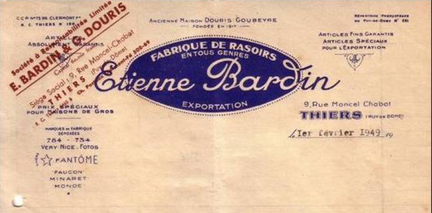 Ε. Bardin & G. Douris (Trade mark FOTOS)Обзавелся вот таким великолепно сохранившимся экземпляром, модель "784". Оригинальный заводской сатин. Ручка - целлулоид. Пины - вероятно сталь (белый металл), внешние шайбы - латунь. Ширина клинка слегка увеличивается от пятки к носку, как на старых французских клинах. На заточке геометрия клинка показала себя с самой лучшей стороны.