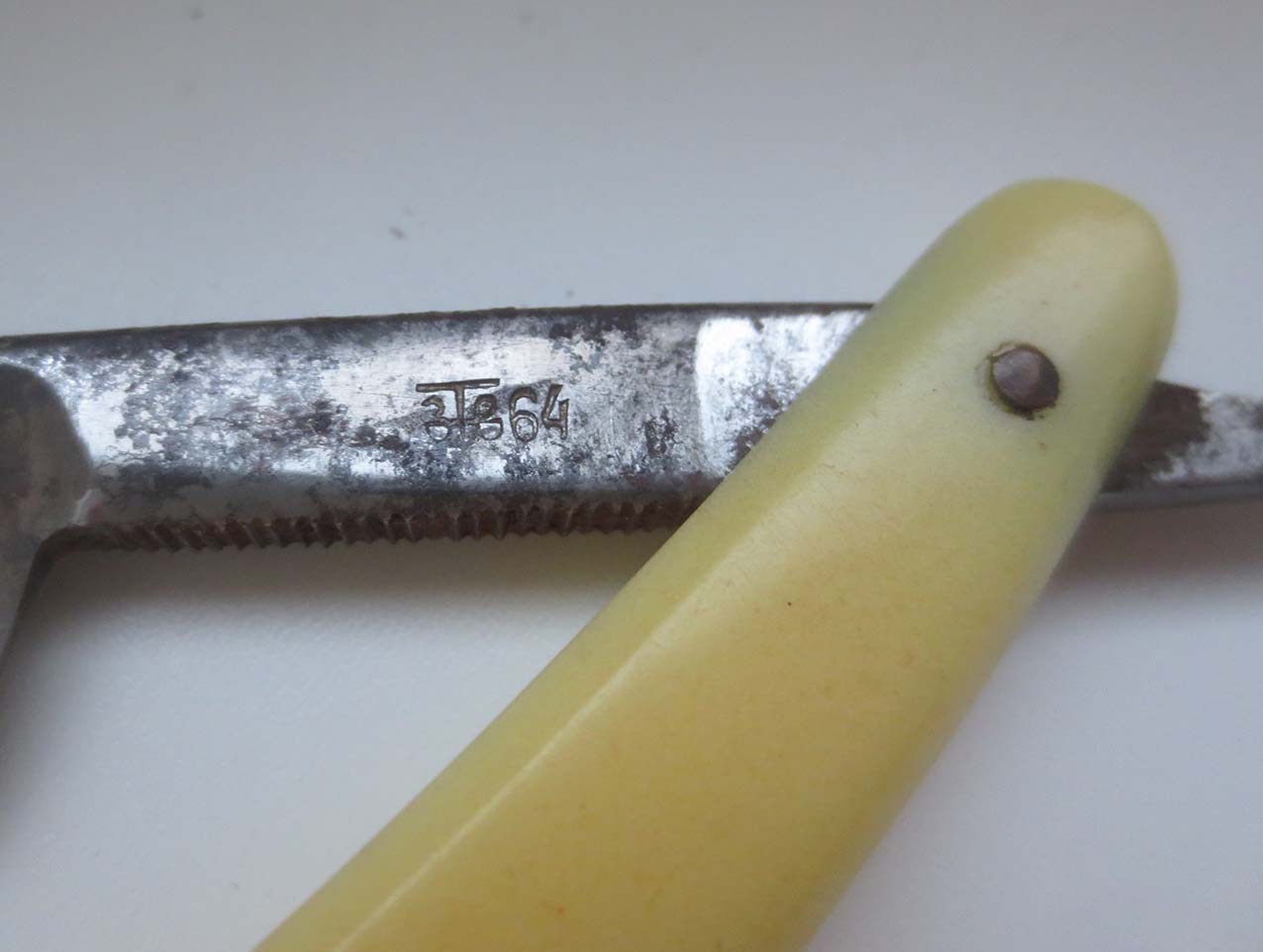 Бритва з-д №9 Мосштамп 1937г. была со сколами, сточил, заточил и побрился. Питтинговое пятно на полотне от целлулойдной "чумы" на оправе. Лезвия Нева первые 1955г. ГОСТ 3547-54 хорошо заточены и бреют (что удивило), вторые 1952г. ГОСТ 3547-47 дерут (одна из двух фасок на стороне не доточена, не выходит на РК процентов 30).