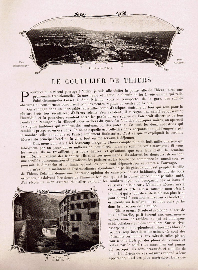 «ТЬЕР, столица французских столовых приборов»: это такой же лозунг, как и реальность. Именно этот город в Оверни за последние несколько столетий произвел более 95% столовых приборов во Франции; даже захват местного производства по привлекательным ценам благодаря конкурентному разделению труда.
