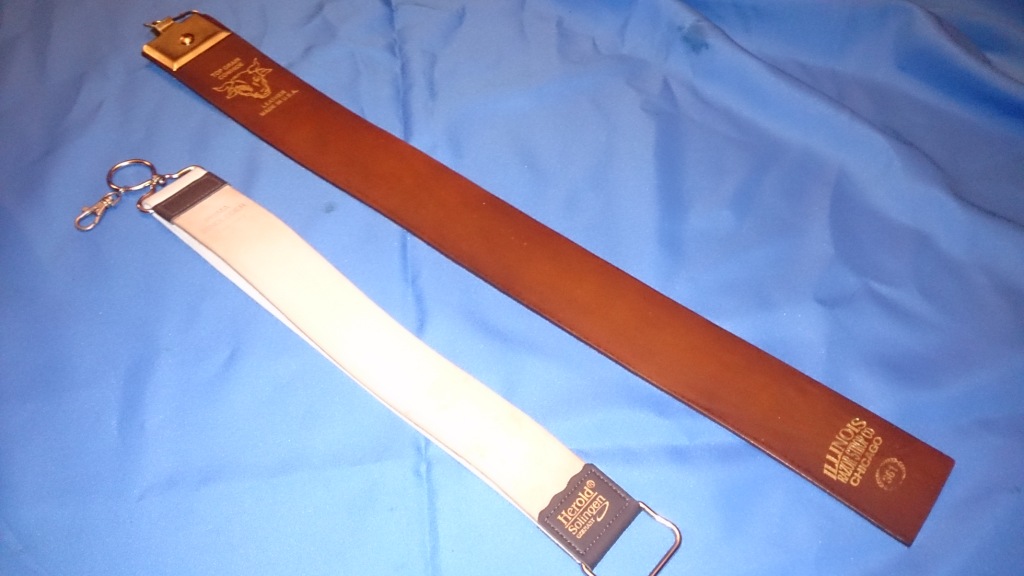 Ремень. Я думаю многие встречали ремни компании Illinois razor strop Chicago, попадаются они на всех торговых площадках посвящённых "влажному бритью". В принципе логично, цена на ремни штата Иллинойс невысока (в районе 40 долларов) да и по качеству их можно отнести к группе товаров широкого потребления. Я заметил что в русско-говорящем сообществе любителей бритья клинковой бритвой как правило первым (и основным) становится ремень фирмы, компании..? Вообще то на этих немецких(?) ремнях может быть написано что угодно, и DOVO и DORKO и Boker и Muhle, даже Exporter solingen. Надеюсь вы поняли о каких ремнях идёт речь, если что, я приложил фото. В общем у нас (у кого это, у нас? Может ты ещё и в "этой стране" живешь?) основными ремнями яв-ся немцы "И вашим и нашим", а у западного сегмента первым ремнём как правило становится Chicago Illinois. Вот и я решил приобщиться, уж больно вид у него завлекательный, прям как в старых барбершопах, широкий, тёмно-алого цвета, с глянцевой поверхностью, в общем полная противоположность моим предыдущим ремням. Но ближе к делу. Главный плюс этого ремня что он работает, я не могу точно сказать насколько хорошо он правит, лучше или хуже моего основного ремня, он просто правит и всё. И я доволен результатом. Может быть это за счёт его глянцевой поверхности, не зеркало конечно, но очень похоже на мой основной ремень, кстати у него эффект глянца появился только после выработки, на неюзанном ремне поверхность была матовая, как будто припудренная. Длина рабочей части 44 см, ширина 6.4 см. Я заказал модель без ручки, так как не владею информацией о качестве прошивки, оторвётся - останутся некрасивые дырки от ниток на коже. Особо хочу отметить возможность разборки ремня, благодаря этому я отделил льняную стропу (надпись на стропе из ткани Linen) дабы совершить так называемый break in, в силу скудности словарного запаса, русский эквивалент этому термину подобрать не могу. Ну, наверно можно сказать что стропу из льна надо "разбить", уработать, так как поставляется она твёрдой как доска (нет, серьёзно, кожаная сторона была эластичней чем лён!). Так что на фото ремень только с кожей, льняная часть отмакает (и периодически отбивается). Из косяков, на обратной стороне кожи имеется трещина, на рабочей поверхности с левой стороны какие-то пятнышки на пол тона темнее цвета самой кожи (см. фото). На работоспособности это никак не сказывается, если будете брать подобный ремень, желательно повертеть в руках. Помазок. Под стать ремню я взял "барберский" помазок. От помазков домашнего использования парикмахерские отличают длинная ручка и невозможность стоять щетиной вверх (я сделал сравнительное фото с типичным представителем семейства "ванных помазков"), впрочем это я так определил для себя помазок цирюльника, не принимайте мои слова за истину. Я уже покупал вариацию на тему "помазок из барбершопа", ей стала кисть Omega 10098. Новый помазок сделан скорее всего китайцами по заказу компании Colonel Conk (полковник Конк). Рукоять лакированое дерево, щетина барсук, "гнездо" щетины из странного пластика. больше напоминающего твёрдую резину. Запах нового барсука специфический, впрочем после трёх-четырёх промываний туалетным мылом он почти исчезает. Щетина у помазка полковника ОЧЕНЬ мягкая, как кисть для рисования, не скажу что это плохо, мой отец например очень уважает мягкие помазки, но конкретно этим я могу бр