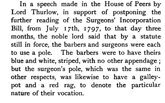 выдержка от туда: не очень понятно, что за закон о хирургах они принимали, но 17 июля 1797 лорд Thurlow, в палате пэров, сказал, что еще в силе закон, который обязывает просто парикмахерам иметь столб с сине-белыми полосами, а хирургам к этому столбу привязывать красную тряпку и тазик. (если я правильно понял, о чем речь)