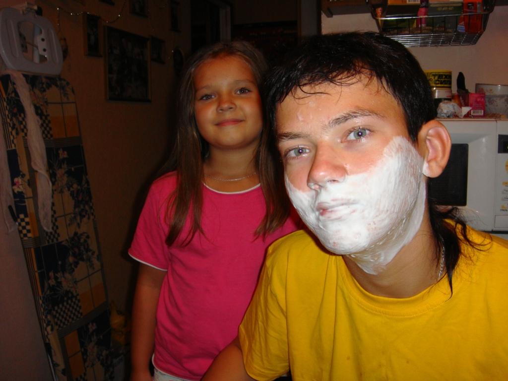 Текущее время: 17.12.25, 17:13 Respect to Tras Krom. Использование WESTER BROS.Модераторы: Олег Бритва, Модераторы Respect to Tras Krom. Использование WESTER BROS.Привезли сегодня Wester Bros... Внешний осмотр бритвы в целом - 4+, лезвие - твердая 5. Ручка с небольшим дефектом, смещение по оси щёчек ручки (но и наплевать на это, скорее всего пины и клепка не родные), потертости на внутренней стороне - тоже фигня. Заточка - отлично. С утра уже побрился, было мучительно думать о том, что сегодня бритву не опробую... По приходу домой выход был найден - у старшего (14 лет, пубертатно-прыщаво-пушковый период)по всему лицу пух, длиной до 4-6 мм, козлиная бородка. Нам с супругой надоел этот вид уже давненько. Сын ни разу не брился... По обоюдному согласию (даже уговаривать не пришлось, сына, я имею ввиду) сын был немного распарен, намылен...и выбрит. Ощущения бреющего немногим отличаются от бреющегося, тот же кайф и выброс адреналина. Бреет отлично, тем более брился мягкий пух, а не торчащая щетина....Короче, фото ниже. Единственное, упустил, догадался фоткать только после намыливания.... Качество, конечно, никакое...в одной руке бритва, в другой фотоаппарат... Естественно кадры сделаны не в момент бритья, а после провода бритвы...Уж извините...