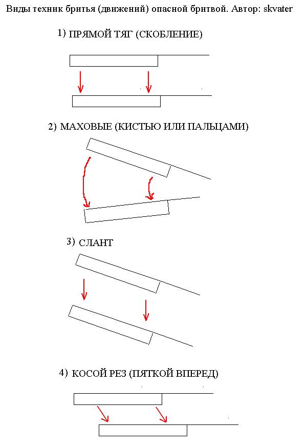 Re: Ссекательные движения были всегда)))Я вижу на щеке человека снято мыло по прямой, по диагонали. Если бы пятка была неподвижна, а носик двигался (типа дворников в авто) - пена была бы снята по дуге. И в правой части рекламки показано исходное положение клинка (пунктиром), стрелки показывают направление движения и сплошными линиями отрисовано финальное положение бритвы. Получается косой рез, по диагонали. Ну или "ссекательные" движения. Это перевод заголовка рекламы - A sliding diagonal shave.