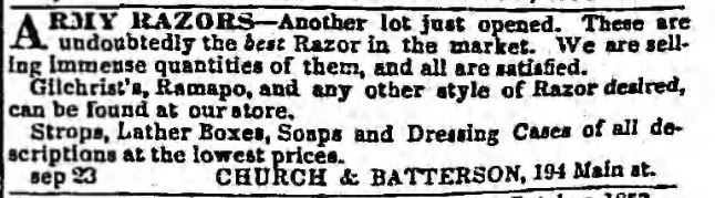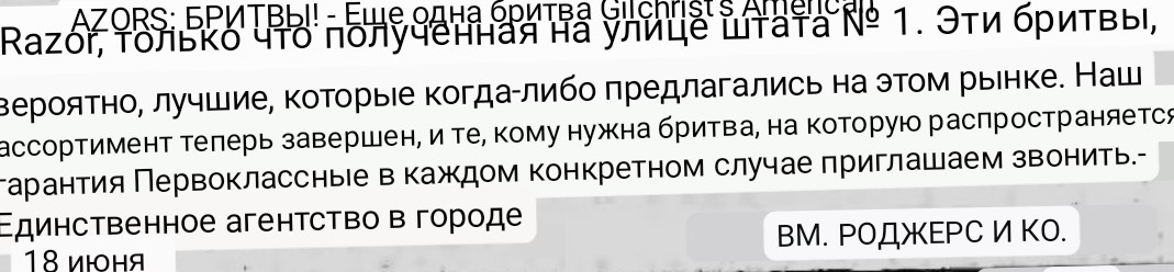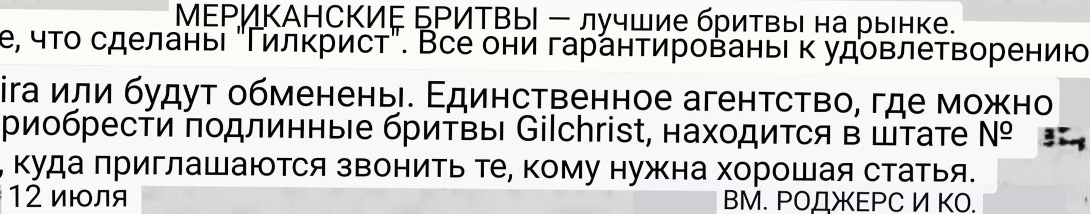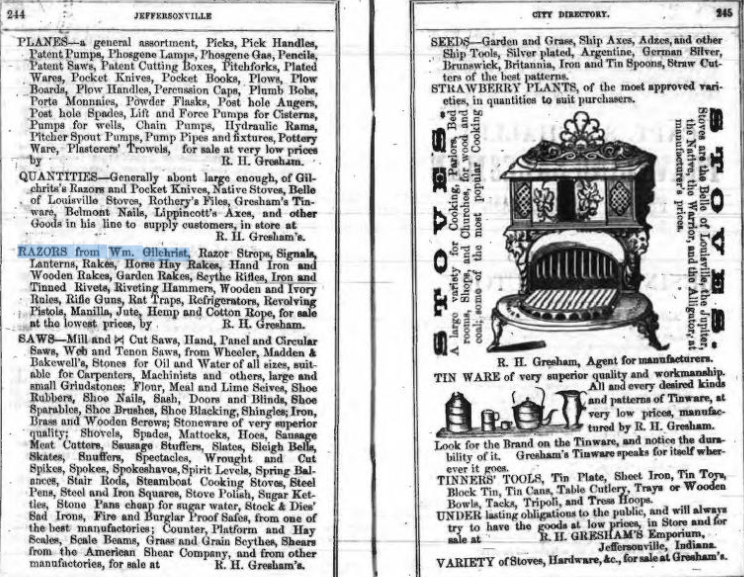 Адрес в Джефферсонвилл, штат Индиана вероятно принадлежал дилеру R.H. Gresham's Emporium, который продавал, в том числе и бритвы Гилкриста.
