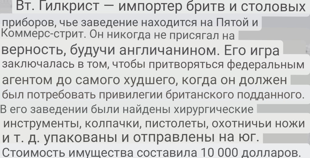 А то в упомянутом бизнес-справочнике я не нашел фамилии Gilchrist в алфавитном перечне бизнесменов))). Поиск внутри книги выдает один результат - на с.241 и с.244, в перечне товаров, продаваемых местным дилером множества производителей разнообразных товаров - R.H. Gresham's Emporium поминаются среди прочего и бритвы от Wm.Gilchrist. Впрочем, может не весь текст проиндексировался в поисковой системе, качество печати книжки весьма среднее, при сканировании возможны ошибки.