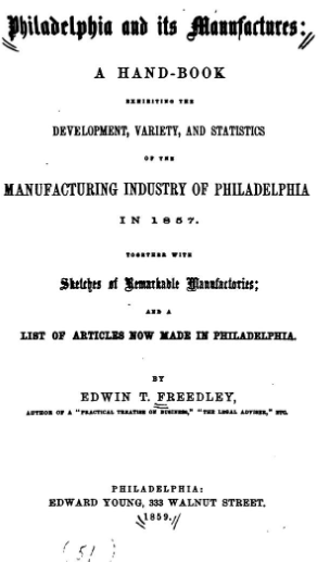 "Филадельфия и ее производство: справочник, показывающий развитие, разнообразие и статистику обрабатывающей промышленности Филадельфии в 1857 году. Вместе с зарисовками замечательных мануфактур; и список статей, которые сейчас производятся в Филадельфии."