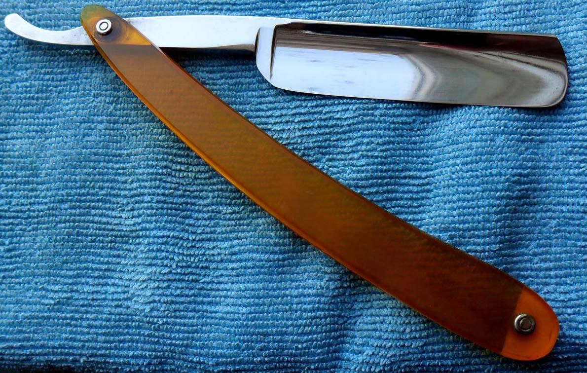 Фирма прославилась одним из самых известных боевых ножей 20 века - KA-BAR USMC http://www.kabar.com/knives/detail/30" onclick="window.open(this.href);return false; Про бритвы информации намного меньше, хотя в общем, в продаже их немало, видимо объемы производства были серьезные. Кстати, по поводу рукояти. Странно, но на американских бритвах довольно часто вижу ручки из оргстекла как раз такого - темно-оранжевого цвета. Это такой распространенный "тюнинг" или действительно после войны фабрики могли делать такие ручки? Еще не брился, но во время доводки бритвы ручка показалась прочной и надежной. Уверен, что в отличие от бакелита, при падении на жесткую поверхность, ручка не разобьется. Кроме того, из-за ее прозрачности после бритья хорошо заметны оставшиеся в ручке капли воды, которые можно сразу же убрать.