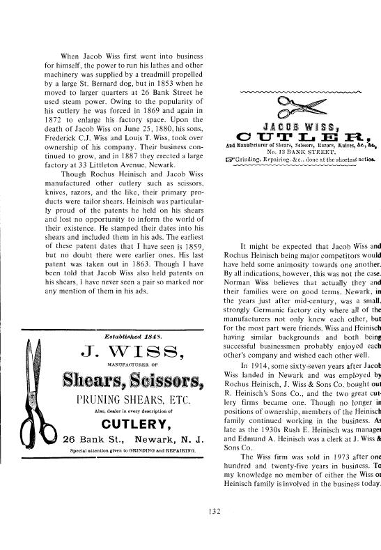 Rochus Heinisch и Jacob Wiss были пожалуй два из самых важных производителей портных ножниц на протяжении 19 ст. Rochus Heinisclt родился в Богемии, Австрия.? 14 февраля 1801 г. Он изучал производство хирургических инструментов в Австрии и Франции. В начале 1820 годов он переехал в США, вскоре после прибытия его посетила идея о производстве ножниц из ковкого чугуна где и сталкивается со сталью. Он был первым, кто запатентовал "портные" ножницы и первый, кто запатентовал сварку стальных изделий. Он начал производство своих усовершенствованных ножниц в Элизабет, Нью-Джерси в I829, но через несколько лет переехал в Ньюарк, где он основал дело по изготовлению столовых приборов . В 1835 Ньюарк каталоге он был указан в качестве производителя хирургических инструментов и других приборов в том числе и столовых при Карьер-стрит возле Вашингтон-стрит. Через годы его главной работой было изготовление ножниц для портных (своих запатентованных), которые оказались очень пригодными и очень ценными для тех, кто был в этой сфере деятельности. Ножницы, которые ранее использовали были английского производства и ручки были настолько неудобной формы, что портные называли "их "инструментами для пыток". Говорили, что "Его" ножницами, один человек может сделать столько, сколько сделают четыре человека другими ножницами. 131 страница Иаков Wiss родился в Soleure, Швейцарии. Я декабря 1817 года изучал торговля хирургического инструмента и производителей в этом городе. После завершения своего обучения он работал как подмастерье, в других частях "Европы. 'В Августе I847 года Он переехал в Нью-Йорк. От туда он отправился в Ньюарк, где он устроился на короткое время и Rochus Heinisch Затем начал свой бизнес . В 1848 году в каталоге он представлен как ножовщик и оружейник на 7-й Банк-стрит. Однако в этом списке он был всего лишь год.Его праправнук Nonnan Wiss, сказал мне, что он уверен, что прапрадед не имел отношение к оружейному делу. Он считает, что друг (Иакова) , который прибыл из Европы в Ньюарк и на некоторое время, и есть тот самый оружейник. 132 страницаКогда Иаков впервые занялся своим бизнесом, движущей силой для его станков служила (механическая энергия) Но в I853, когда он переехали на 26 Street он начал использовать паровую энергию. Благодаря популярности его столовыми приборами он был вынужден расшириться в 1869 году и снова в 1872, для повышения производственных мощностей. После смерти Иакова 25 июня. 1880 года его сыновья Фредерик CJ. Висс и Луис Т. Висс, взял на себя управление компанией. Бизнес продолжал развиваться, и в 1887 году Они построили большой завод на 33 Литтлтон Avenue, Newark. Хотя Рохус Heinisch и Иакова Висс, изготавливали и другие приборы, такие как: ножницы, ножи, бритвы. и тому подобное, их основной частью (направлением) были портные ножницы. Рохус Heinisch в частности гордился патентом, которым он обладал на свои портные ножницы, и тем, что Он показал всему миру Их. Он ставил дату патента на ножницах, что было хорошей рекламой. Самые ранние из этих дат, которые видели, были 1859 года.(на ножницах) но несомненно, были и более ранние. Его последний Патент был внесен в 1863 году. Хоть и есть сведения, что Иаков Висс также ставил номера патентов, как рекламу, на свои ножницы, но таковы не попадались. Можно было бы полагать,(для большинства) что Иаков Wises Рохус Heinisch являясь основными конкурентами, враждовали по отношению к друг другу, по всем 