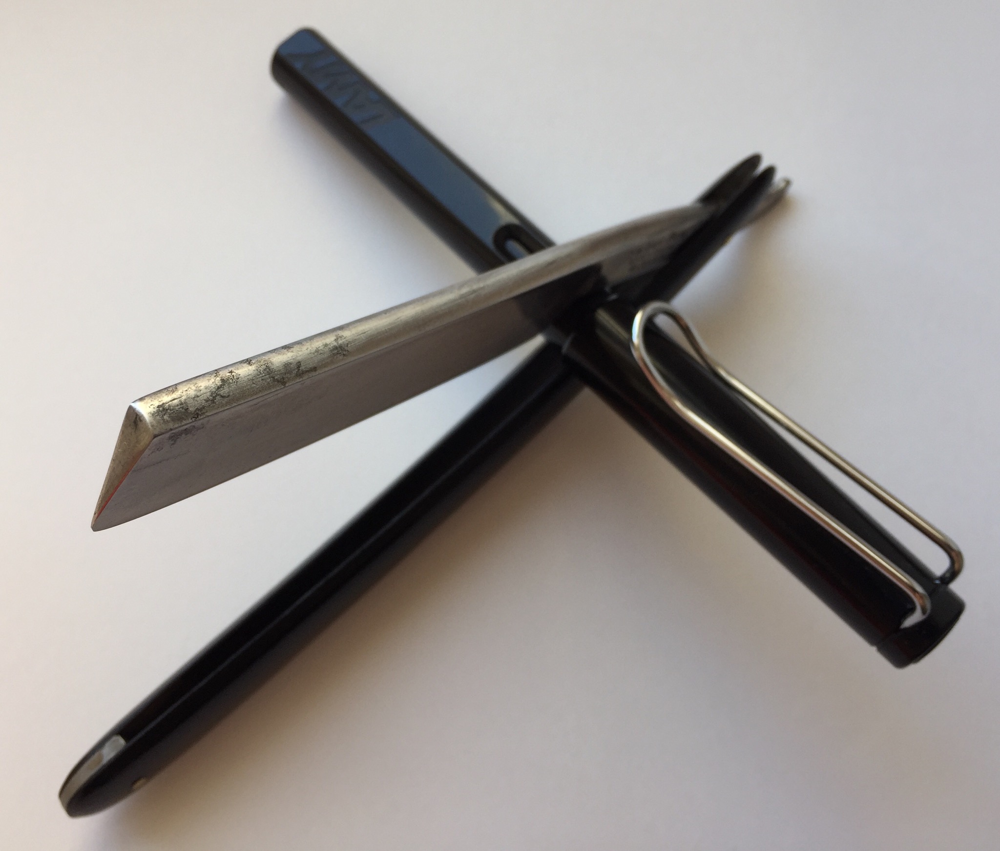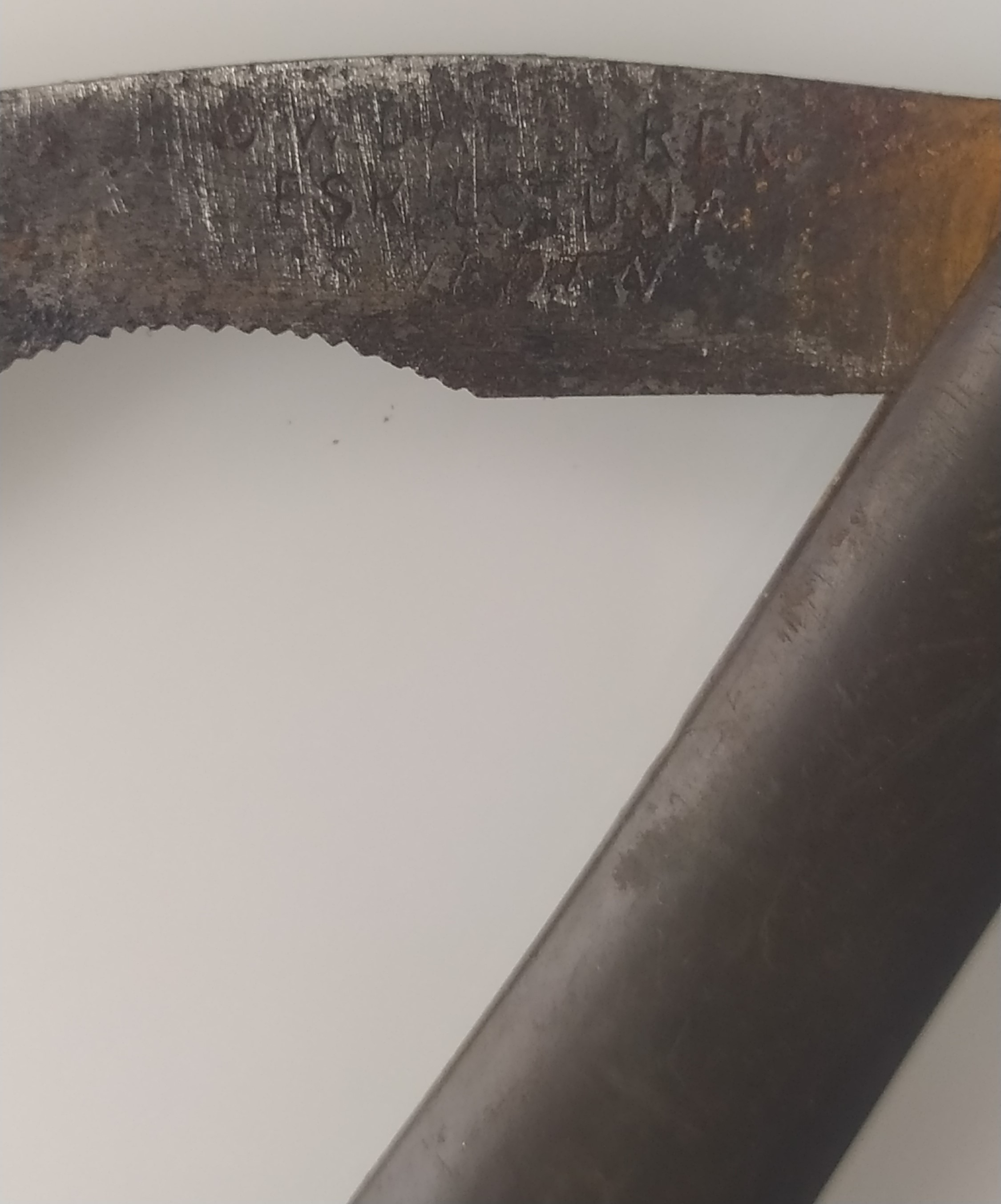 Ручка-черное дерево(предположительно эбен) чем-то пропитано с фабрики, поразительно твердое. Размер полотна ближе к 5/8. Вогнутость-почти клин. Ручная ковка. Период изготовления предположительно 189х-1920